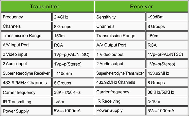 - Support video transmission of PAL/ NTSC system and stereo audio transmission, Pictures received are clear, flamboyant and stable.