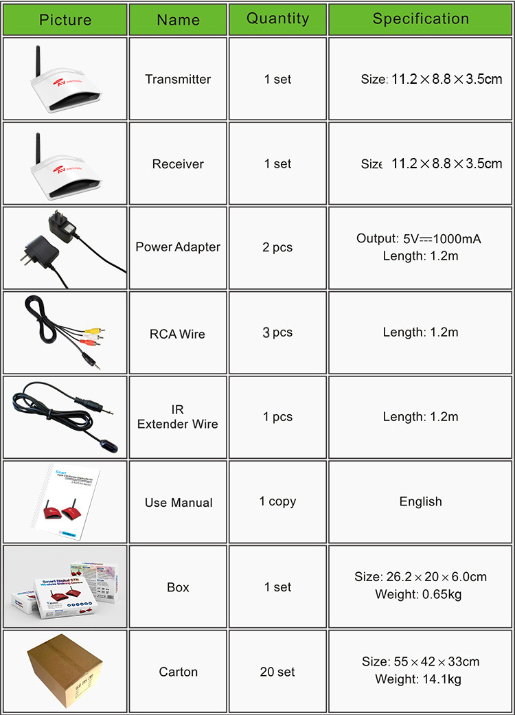 - Transmitter have built-in infrared signal emission or have infrared transmission extension cable, so that you can do remote control the signal from DVD, DVR, STB, IPTV and other device.