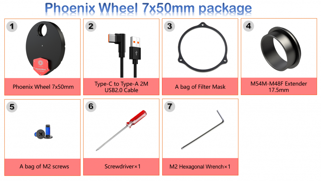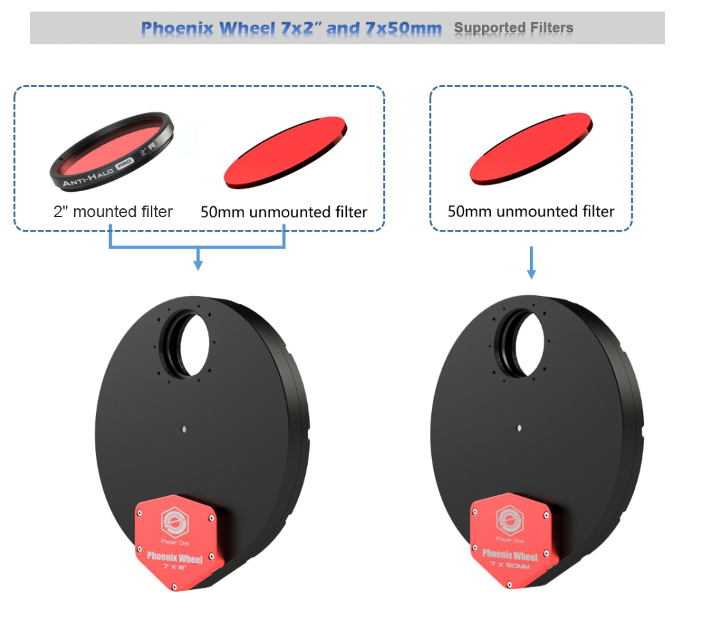 Filter positions of Phoenix Wheel 7x50mm support 50mm unmounted filter. Clear aperture is 49mm which is bigger than that of 7x2" wheel. It can give less vignetting when you are using full-frame cameras.
