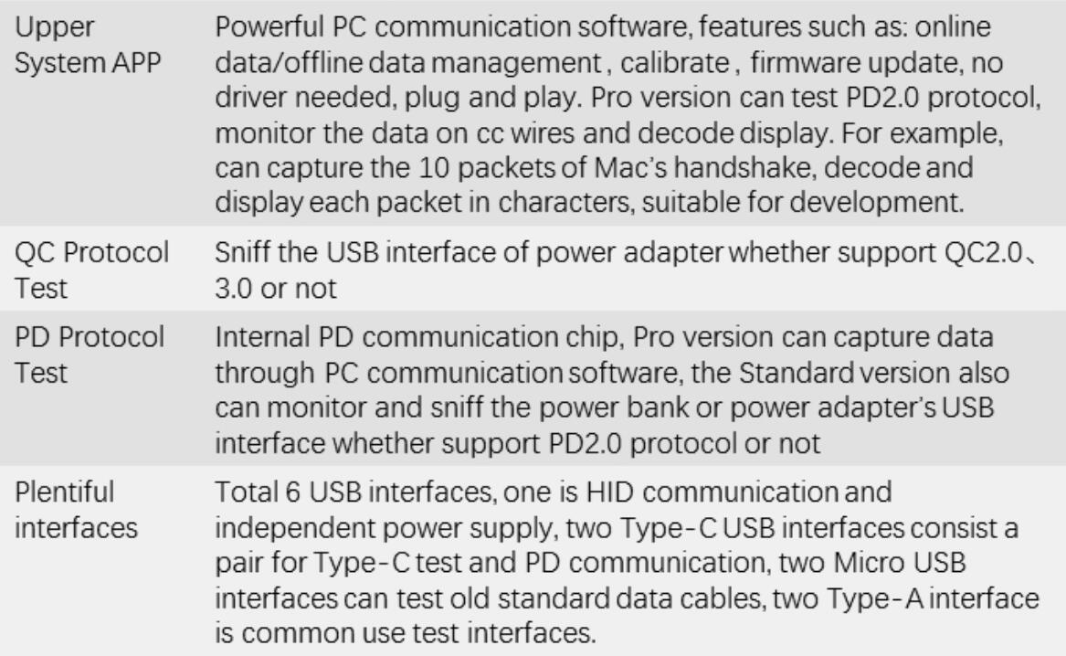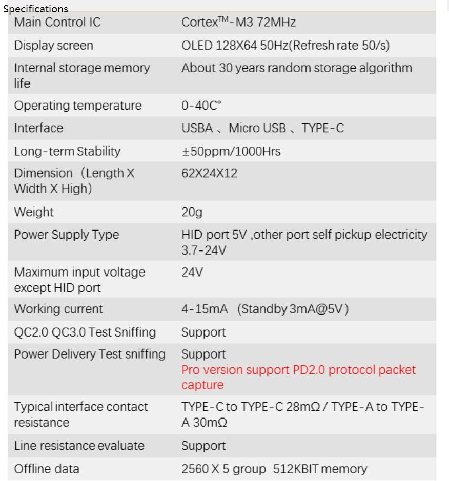 - Power Delivery Test Sniffing:Support;Pro version support PD2.0 protocol packet acquisition