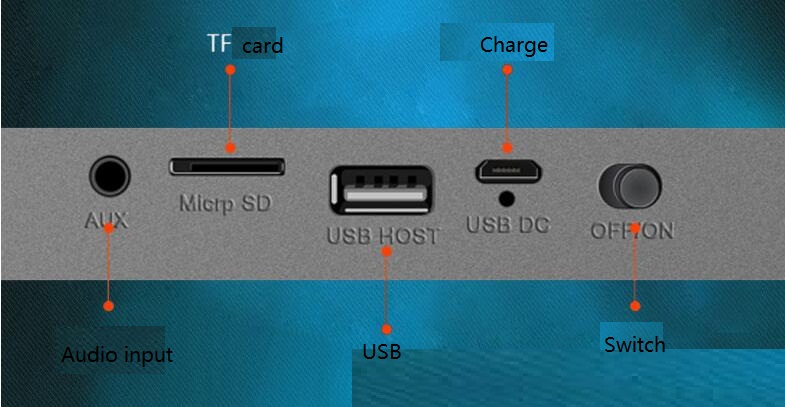 - Audio input:AUX,TF card,bluetooth,FM,U disk