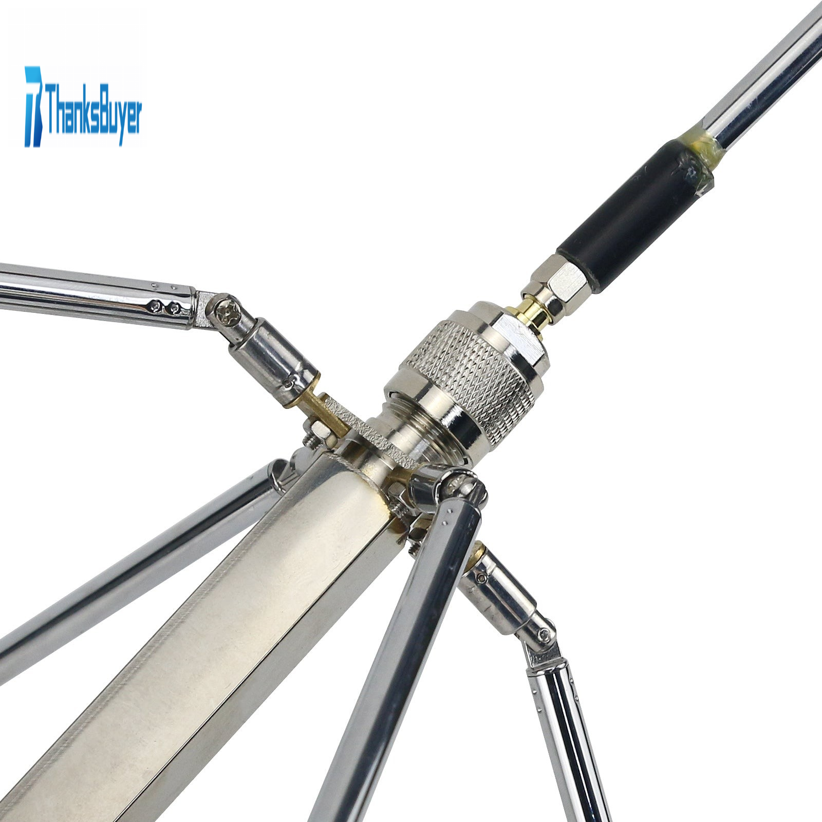The length of the 4 counterpoises is generally the same as the length of the vertical antenna in the middle. The angle of the counterpoise is usually a downward slope of 45 degrees, and the specific length and angle can be adjusted during use or with the help of a meter. Usually, the higher the counterpoise angle is, the higher the antenna center frequency will be. When the length of the antenna and the angle of the counterpoise remain unchanged, shortening the length of the counterpoise will also increase the center frequency of the antenna. In actual operation, the length and angle of the four counterpoises can be different, so that different standing wave and center frequency effects can be obtained. In short, the 4 counterpoises can be adjusted in any length and angle. For short-wave signal reception, because the short-wave frequency wavelength is very long, for example, the length of the 1/4 wavelength antenna of 14MHZ signal is about 5.1m/16.7ft, so you can use copper wire to wrap the antenna and counterpoise, to further increase the length to better its reception effect.