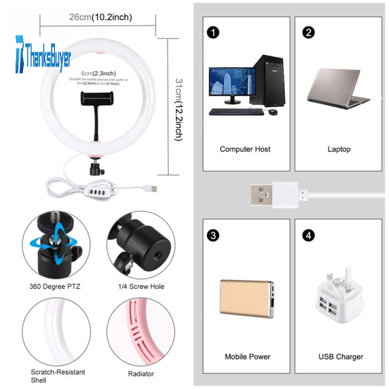 5. The USB ports can be used with multiple devices, such as connect computer host, laptop, mobile power and USB charger. You will be able to enjoy LED ring light at any time free.