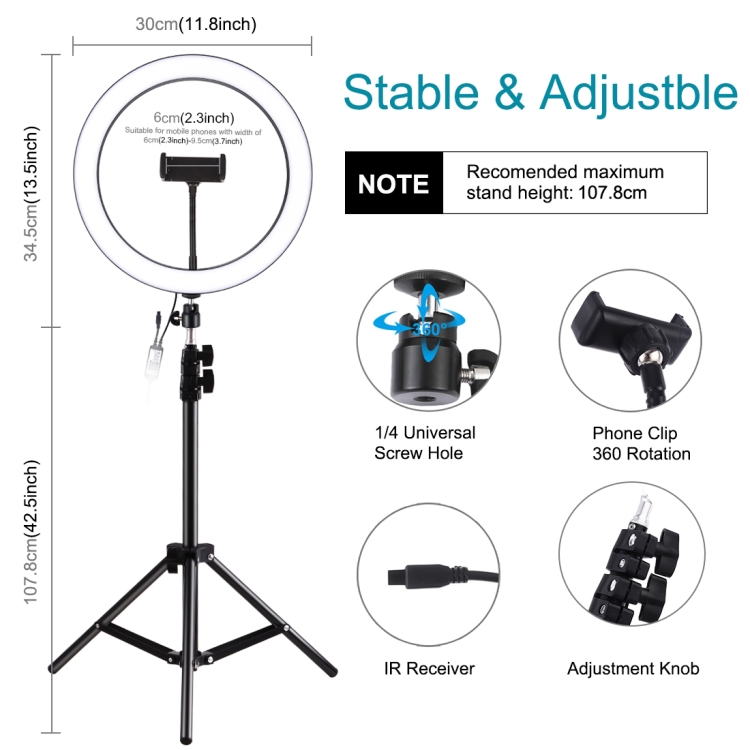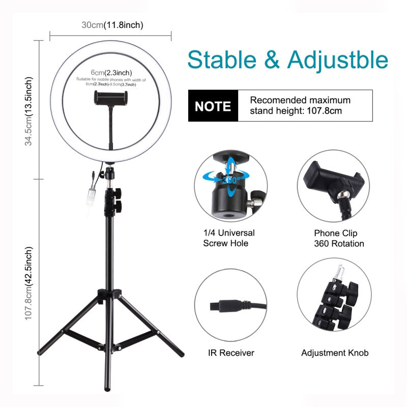 11.8" Dimmable LED Ring Light with Tripod Stand 1.1m w/ Tripod Ball Head & Phone Clamp PKT3050
