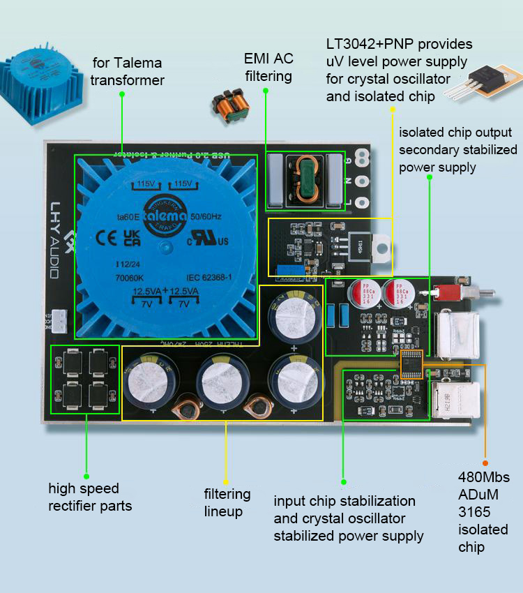 - The UIP-Lite input terminal is equipped with advanced USB input port ESD protection. The core adopts a USB2.0 high-speed 480Mbs ADuM3165 isolation chip, with an isolation voltage of up to 3.75kv rms, and is equipped with a high-precision and low jitter silicon crystal oscillator, as well as a 3042+pnp uV level pure linear power supply, which can effectively isolate the power and ground interference of the USB port, effectively isolate the complex noise and electromagnetic interference of the front-end, purify the USB signal, and replace the power supply of the output port with a linear power supply.