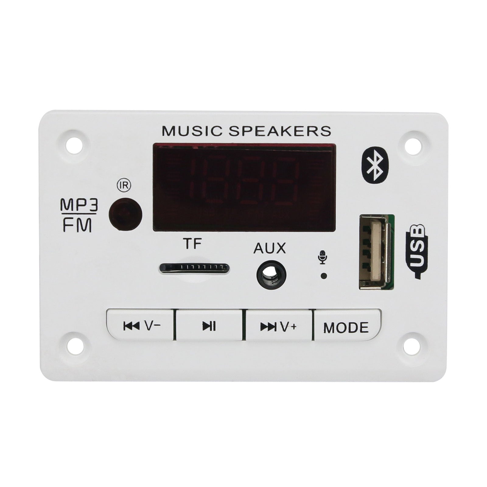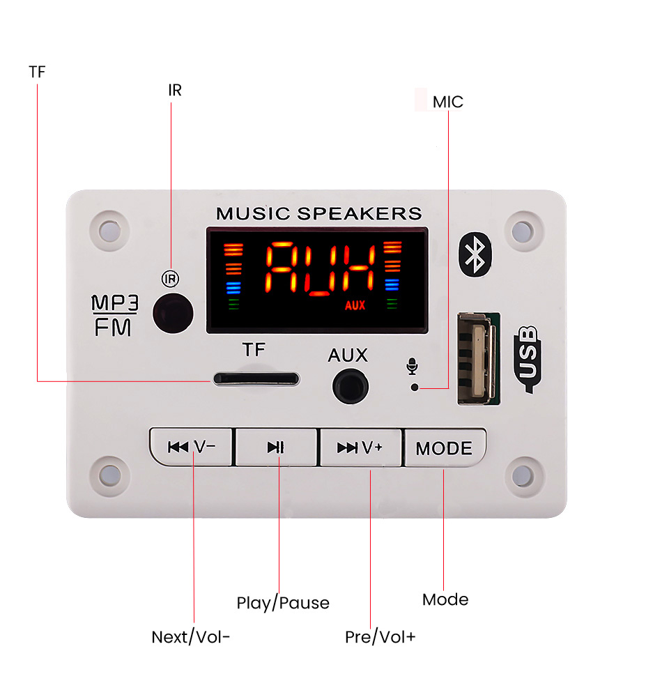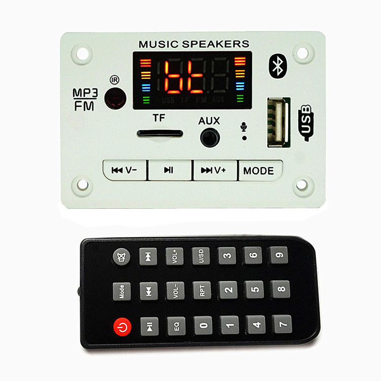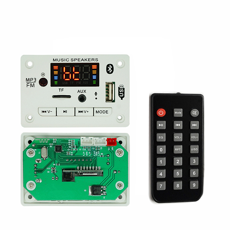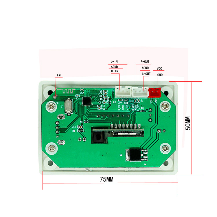 The panel size is 75*50mm*18mm. The decoder board supports audio decoding MP3, WMA, WAV, FLAC/Bluetooth call function/with recording function/read USB disk/read TF card/FM radio/AUX audio input/infrared remote control/shutdown memory/12V power supply.