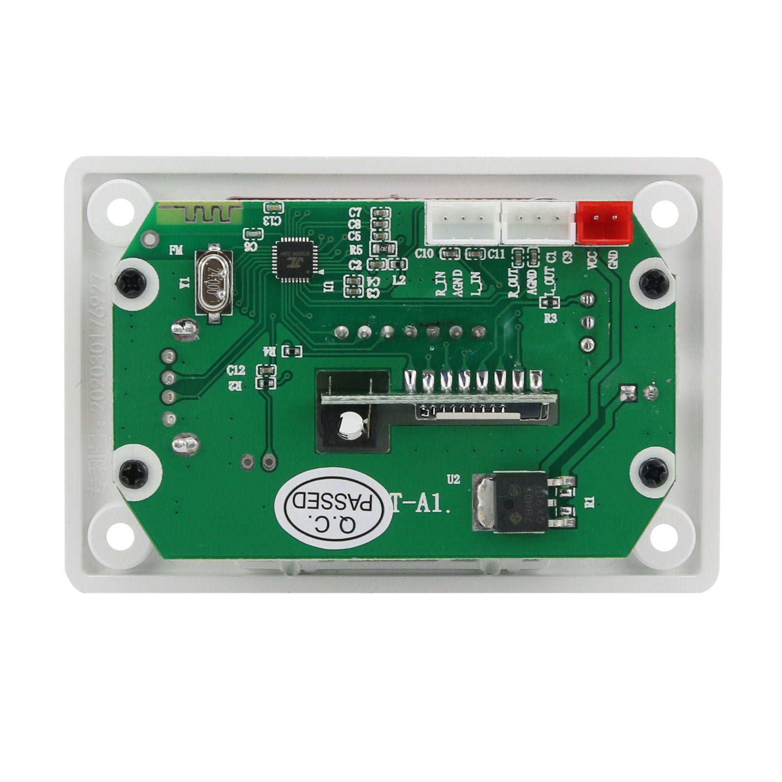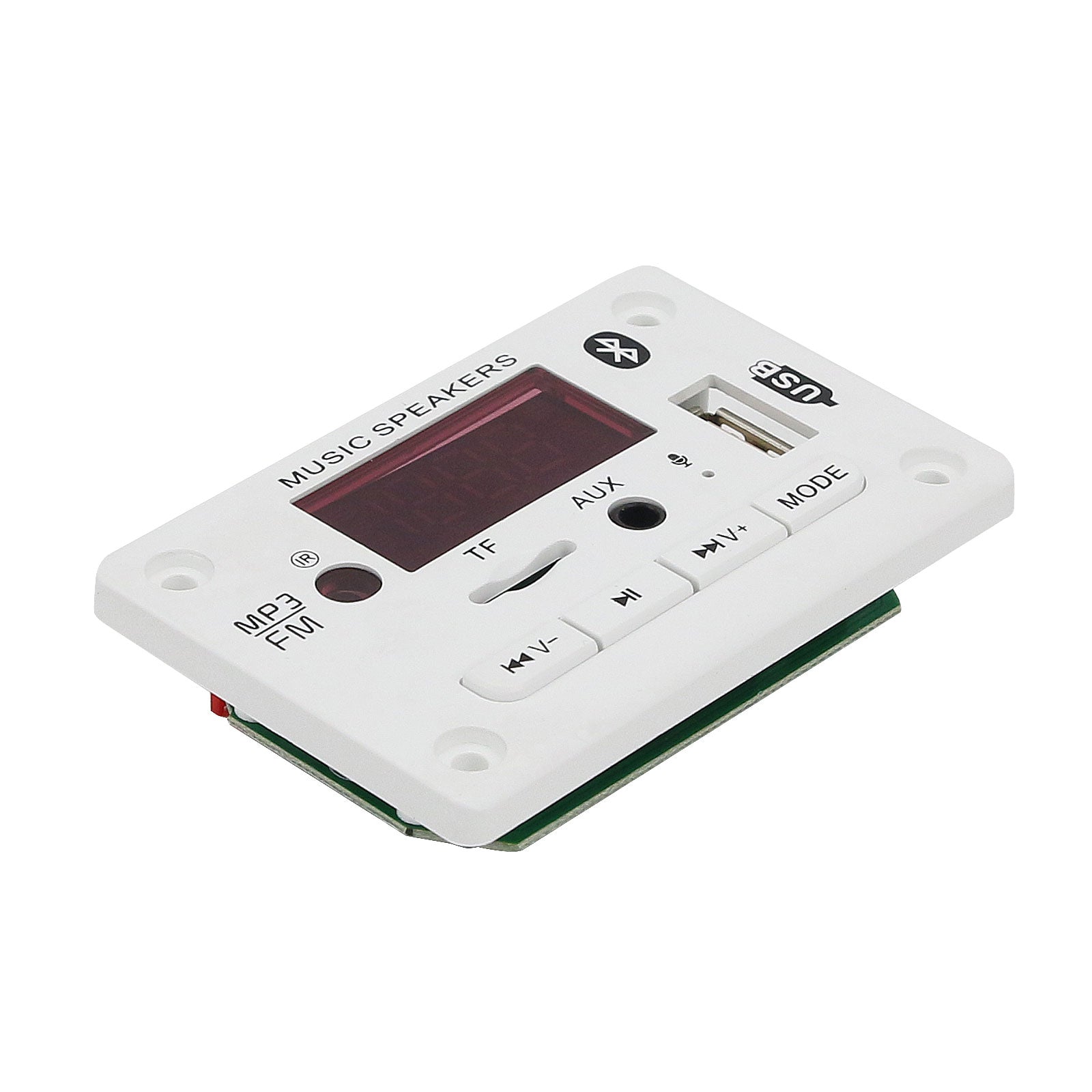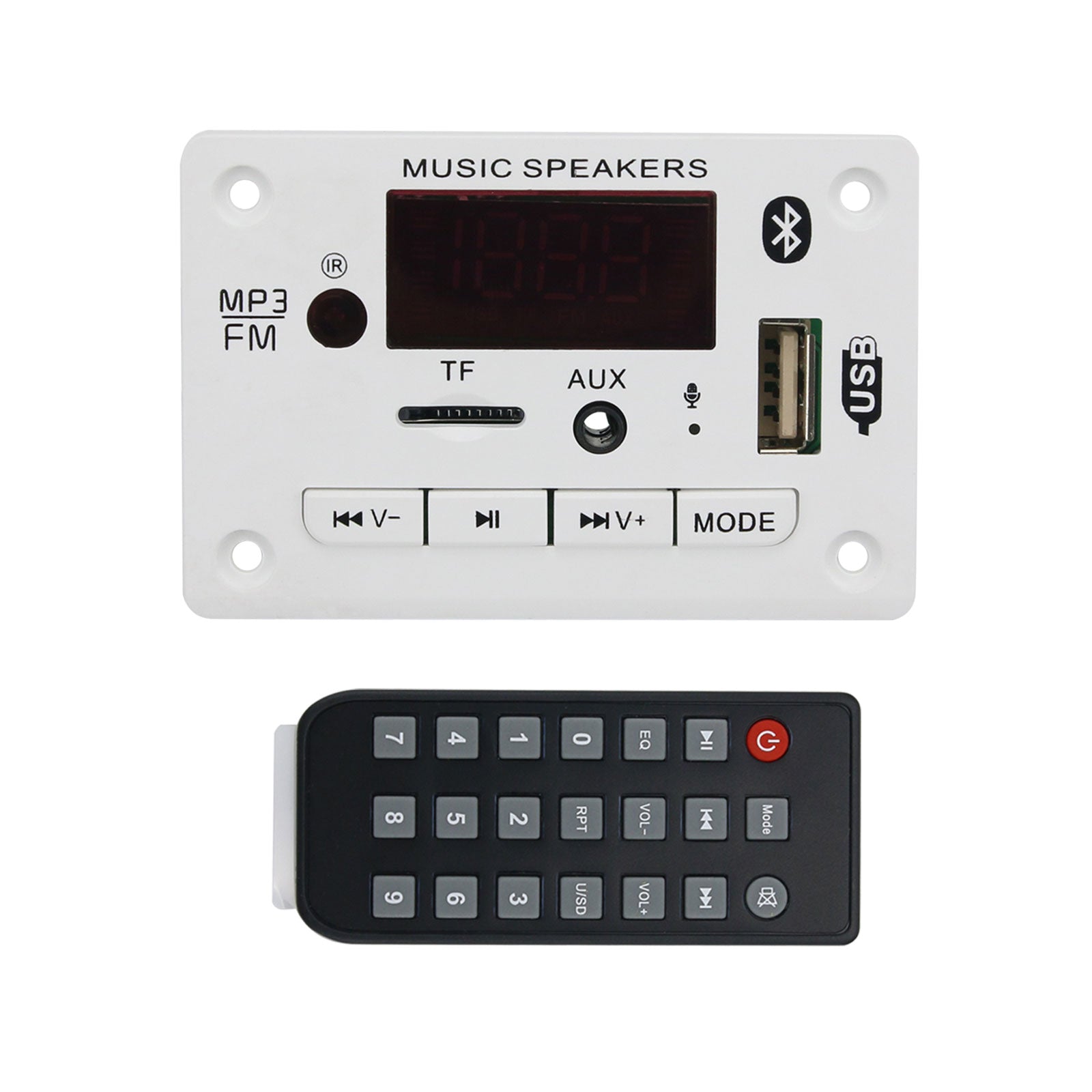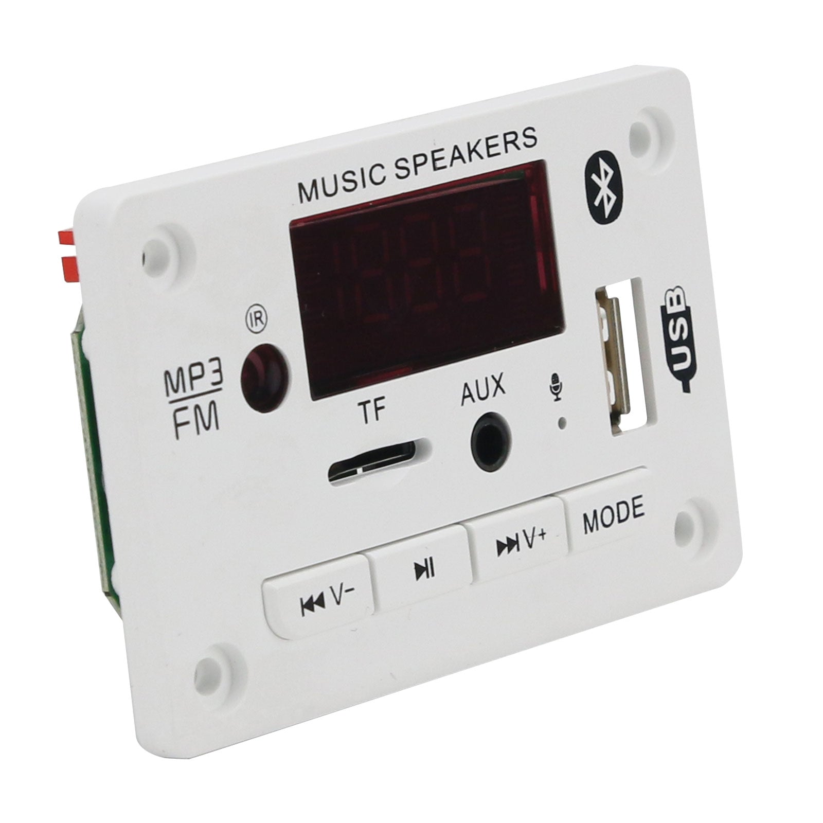 The panel size is 75*50mm*18mm. The decoder board supports audio decoding MP3, WMA, WAV, FLAC/Bluetooth call function/with recording function/read USB disk/read TF card/FM radio/AUX audio input/infrared remote control/shutdown memory/12V power supply.