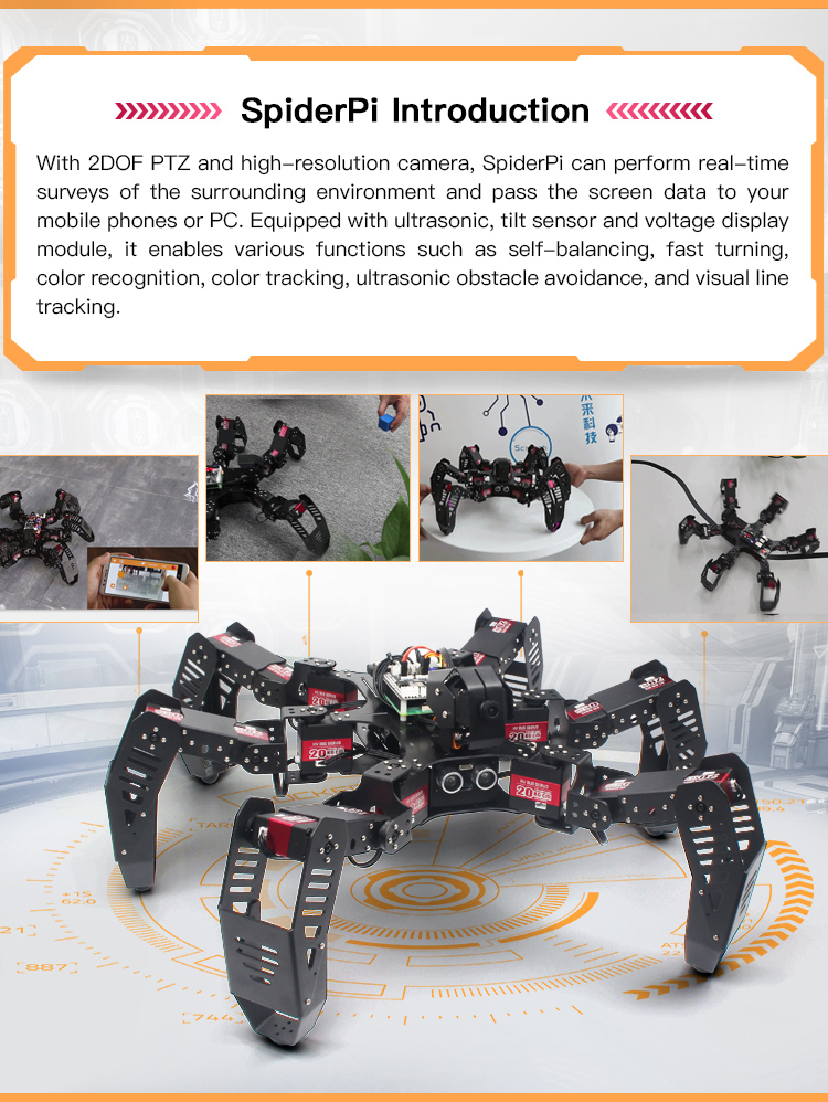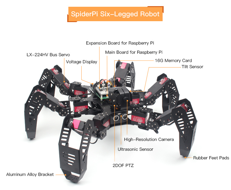 18DOF Hexapod Robot Spider Robot 2DOF PTZ with Main Board for Raspberry Pi 4B/1G Finished