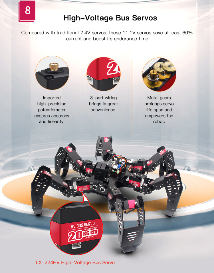 - High-Voltage Bus Servos: Compare with traditional 7.4V servos, these 11.1V servos save at least 60% current and boost its endurance time.