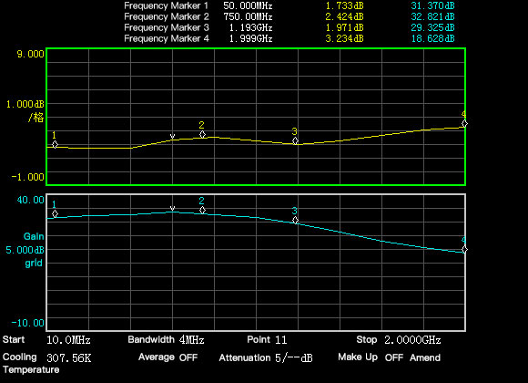 Factory reference S21 (blue curve) and noise figure (yellow curve) parameters