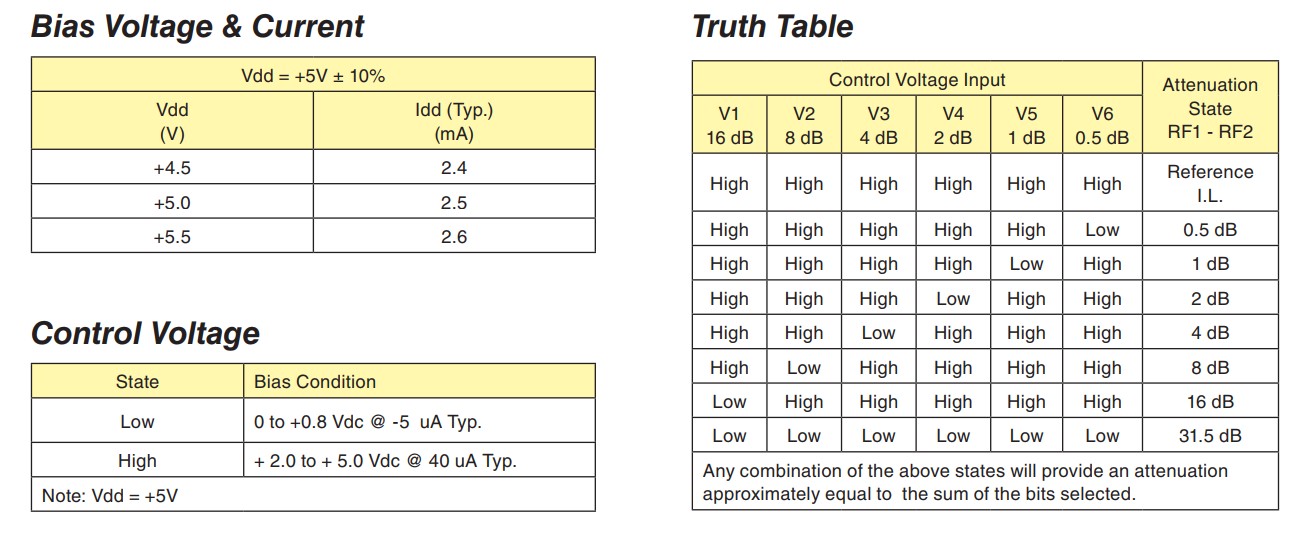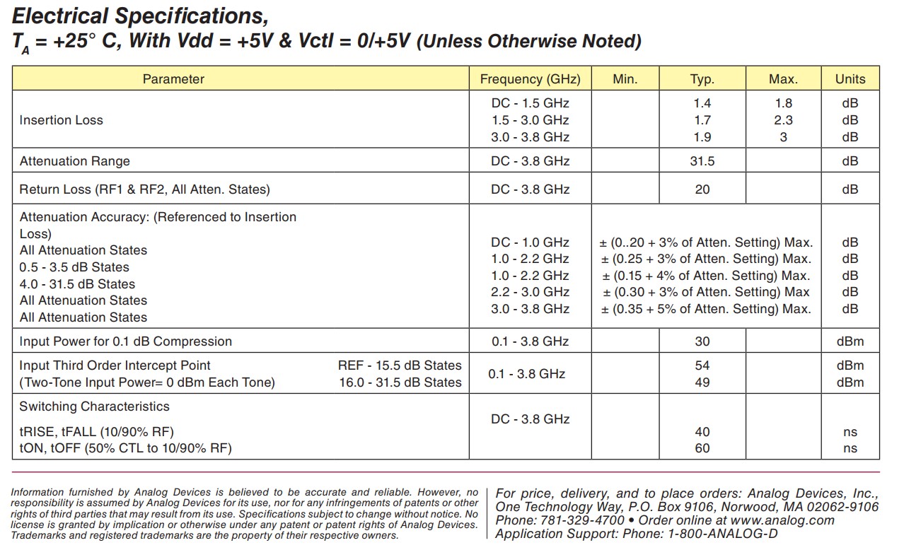 HMC472 is a broadband 6-bit digital attenuator with an attenuation range of 0~31.5dB and a typical step error of ±0.25dB. It adopts QFN surface mount package, single power supply 5V power supply, operating frequency range from DC to 3.8 GHz, and insertion loss below 2.0 dB (typical value), IIP3 is +54 dBm, suitable for various RF and IF applications.