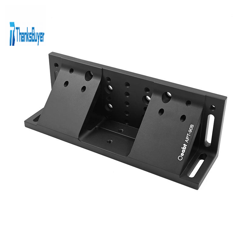 - The APT-90 right-angle adapter has front and rear panels that are 90° to each other, which is very suitable for three-dimensional optomechanical systems that require vertical positioning. There are 4 6.1*22.1mm through-hole slots, 7 M6 screw holes and 2 Ø6.3mm countersunk holes on the front surface. The bottom panel contains 2 6.1*31.1mm through-hole slots, 10 M6 screw holes and 2 Ø6.3mm countersunk holes for mounting to the optical table.