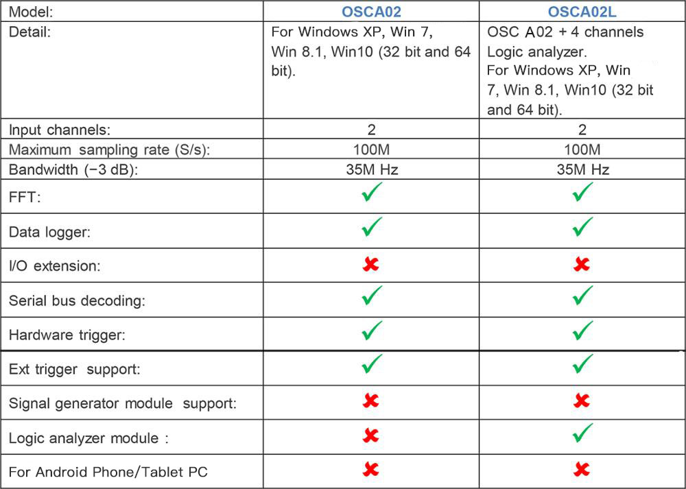 - OSCA02= Basic version. 100MS/s sampling rate, 35MHz Bandwidth, 2-channel.