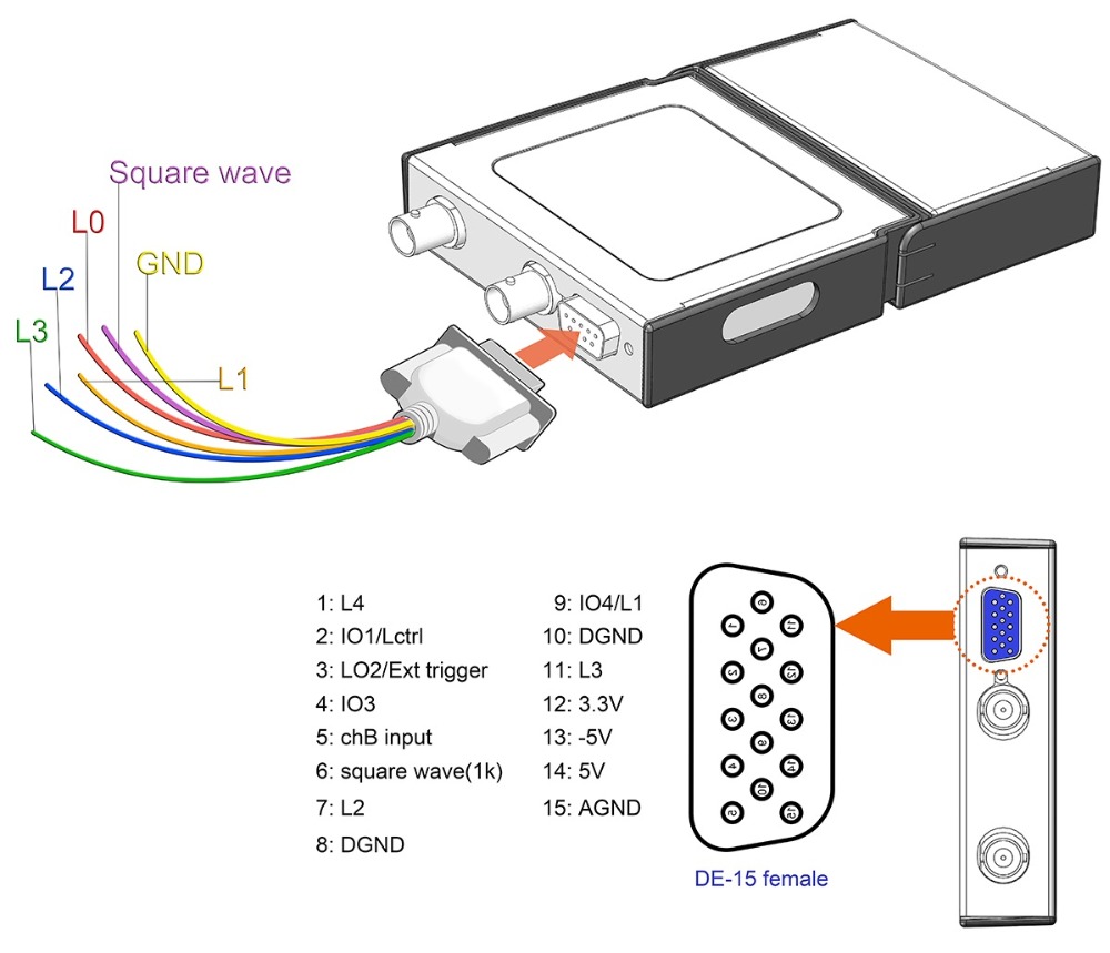 let's take a look at the product hardware interface for extensions: The open DE-15 hardware interface can provide digital power as well as analog power, GPIO ports and analog input channels as shown below. This interface an be used as a standard access for signal generator modules or logic analyzer modules. Although these two modules can be plug and play in frequent use, it is recommended to connect the module after the device is powered off.