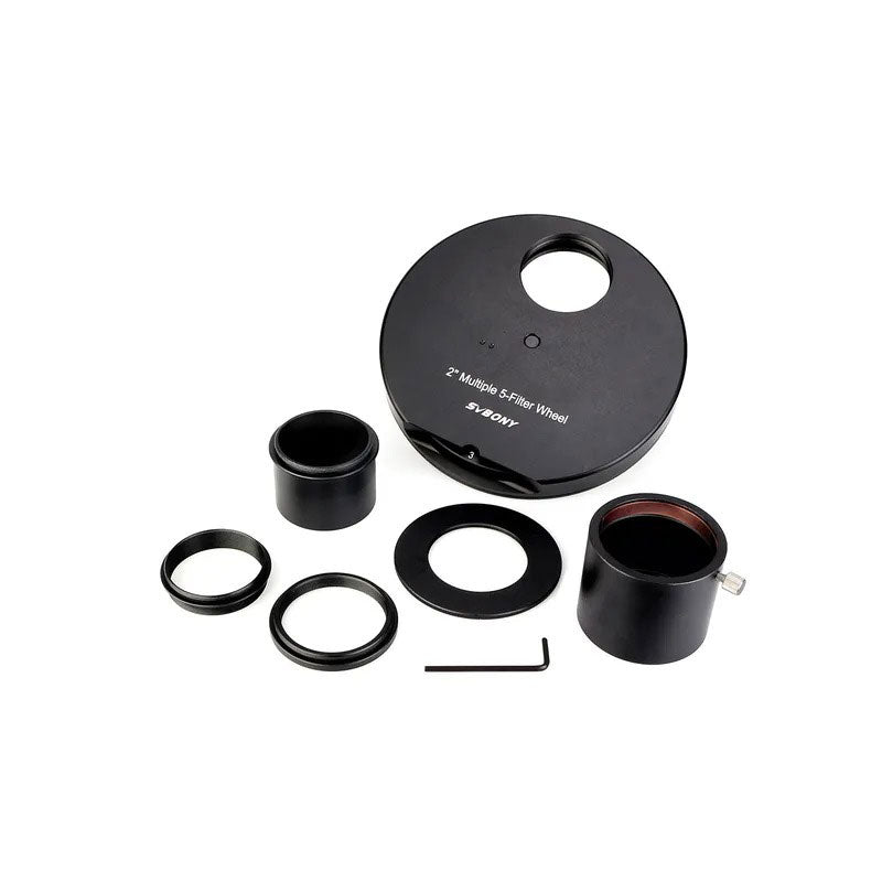 - The robustly constructed filter wheel is supplied with a 2" eyepiece adaptor, 2" focuser nosepiece, 2" conversion interface, M48 camera adapter and rotation lock ring.