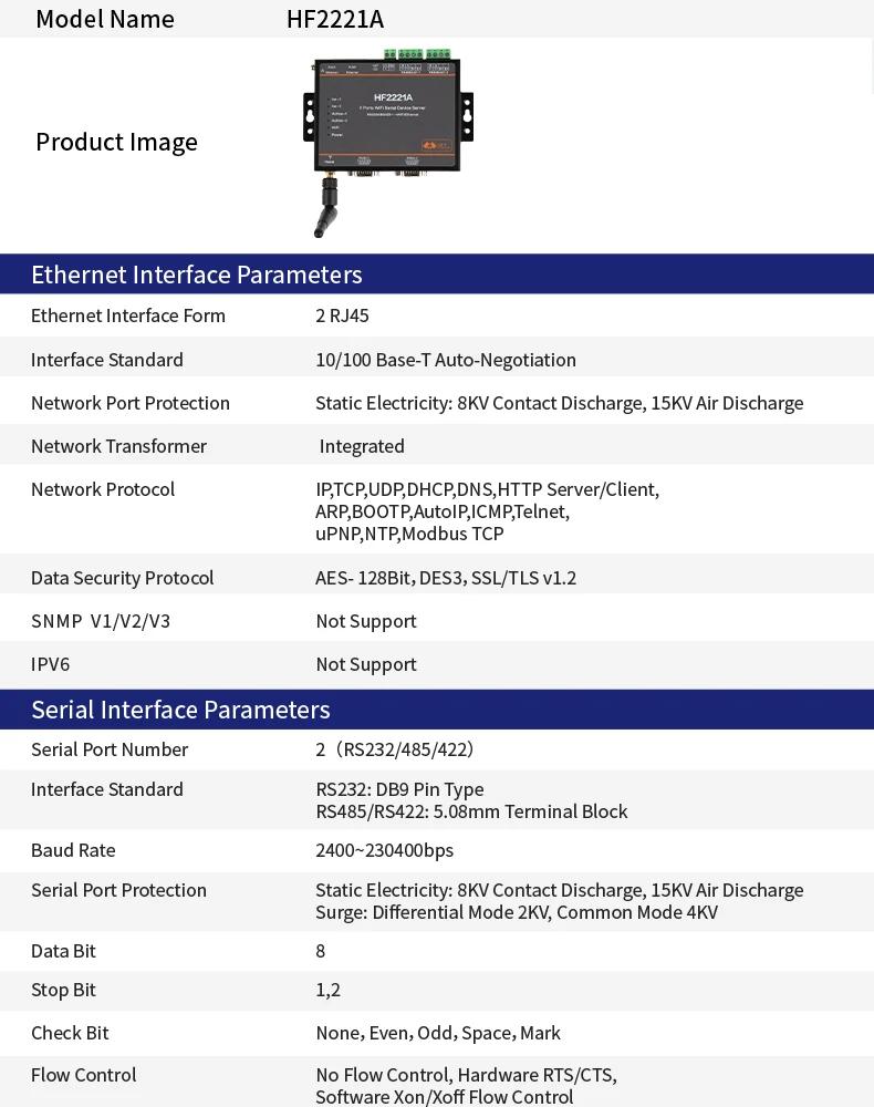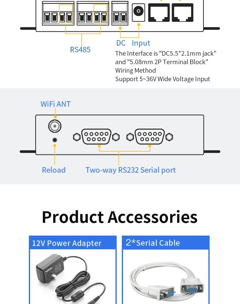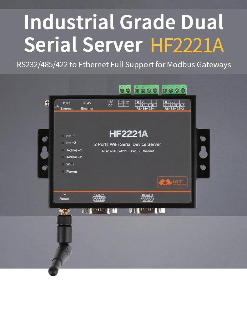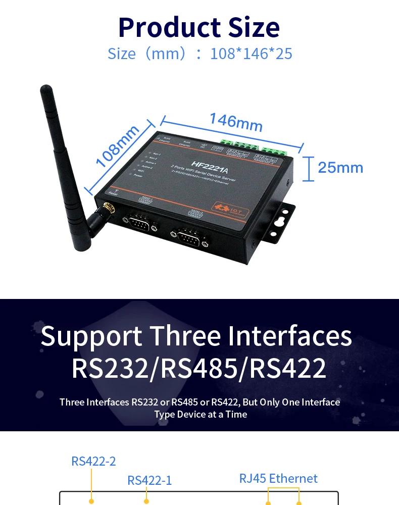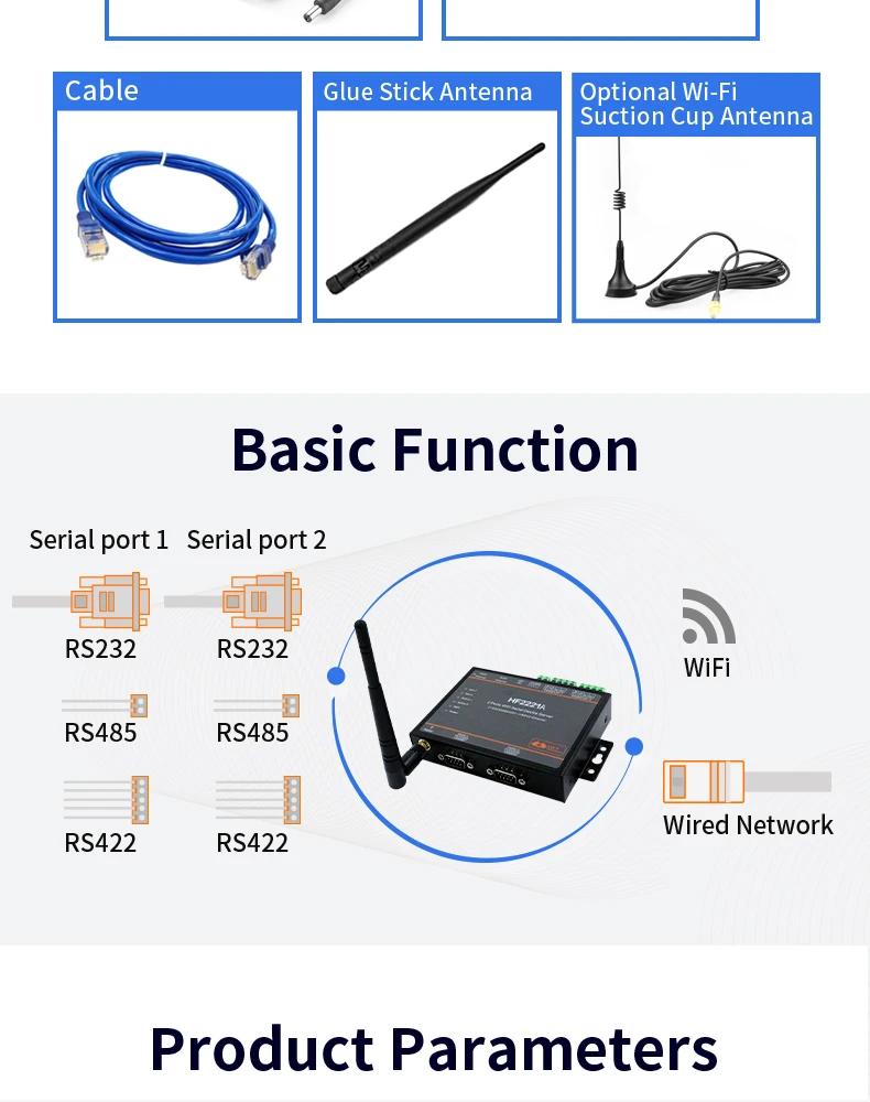 2 Ports WiFi Serial Server RS232/485/422 to WiFi/Ethernet Support for Modbus Gateways with HF2221A Rubber Rod Antenna