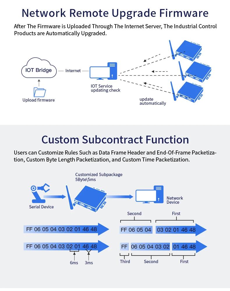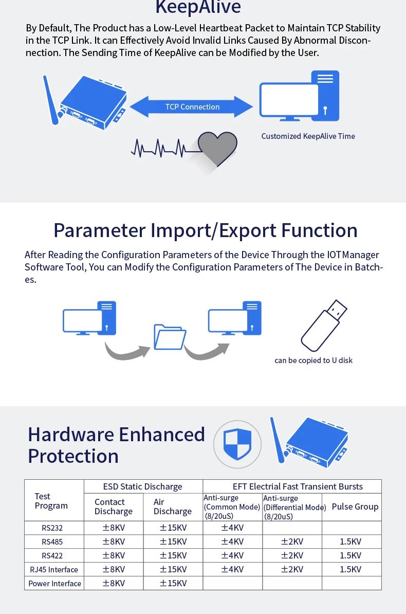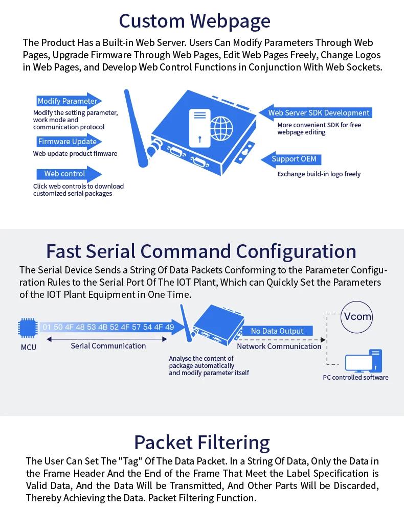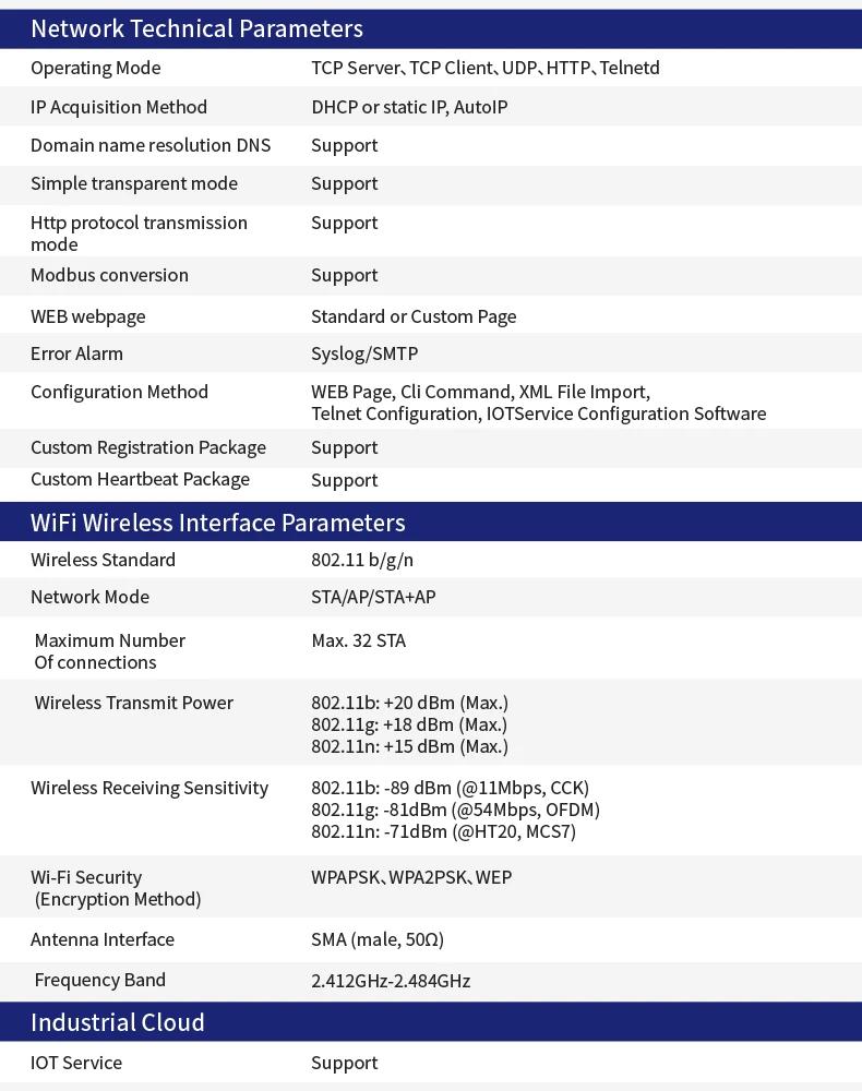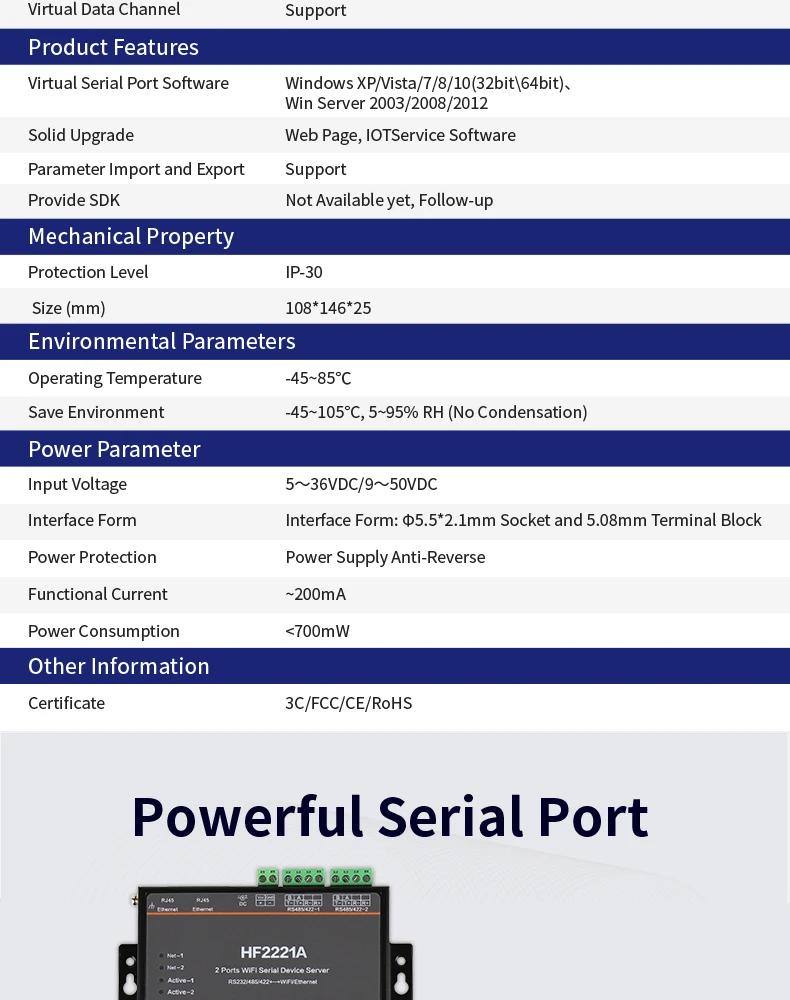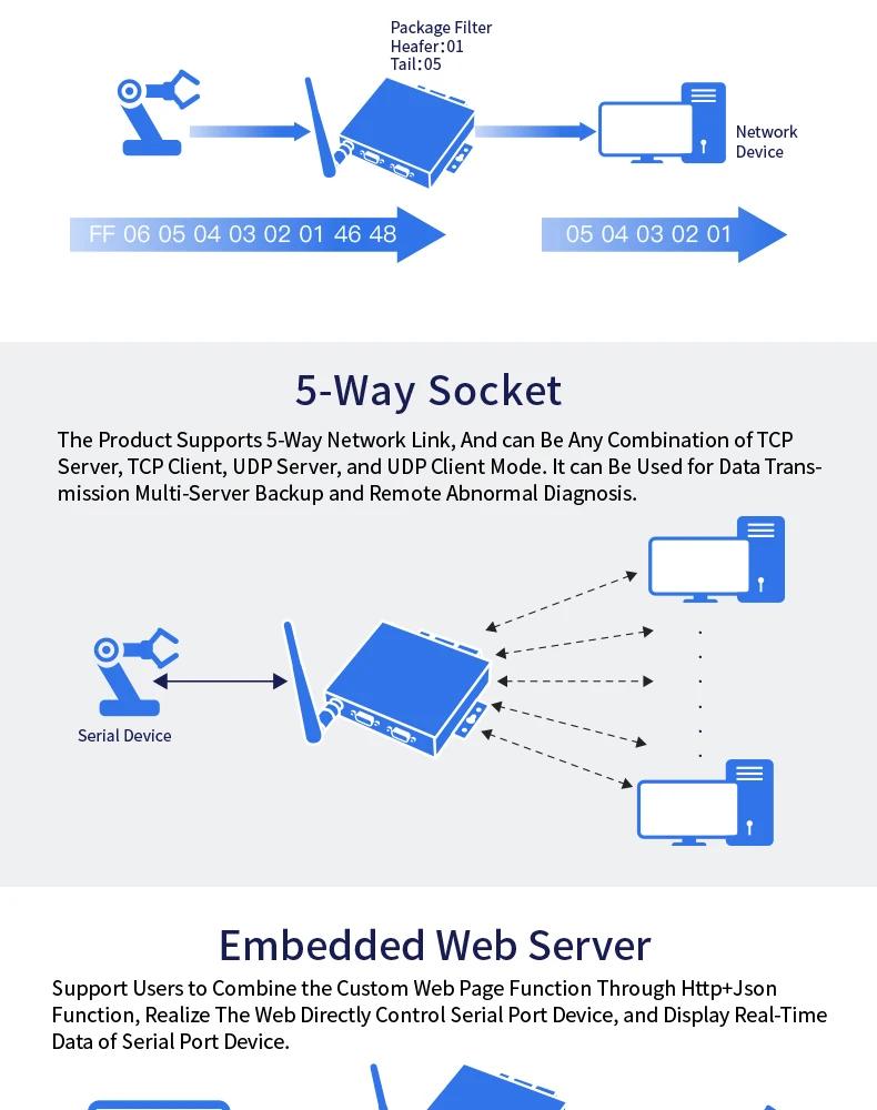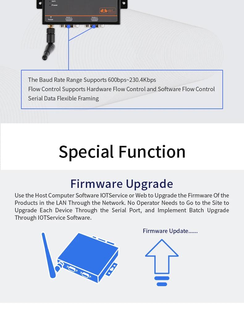 - Support 2 channel RS232/RS422/RS485 to Ethernet/Wi-Fi conversion, serial speed up to 230400bps