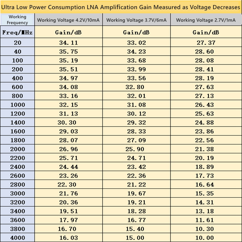 - It is a low-power, high-gain low noise amplifier, which can be used for general frequency band such as VHF, UHF, for Beidou, positioning, navigation, VTX, etc.