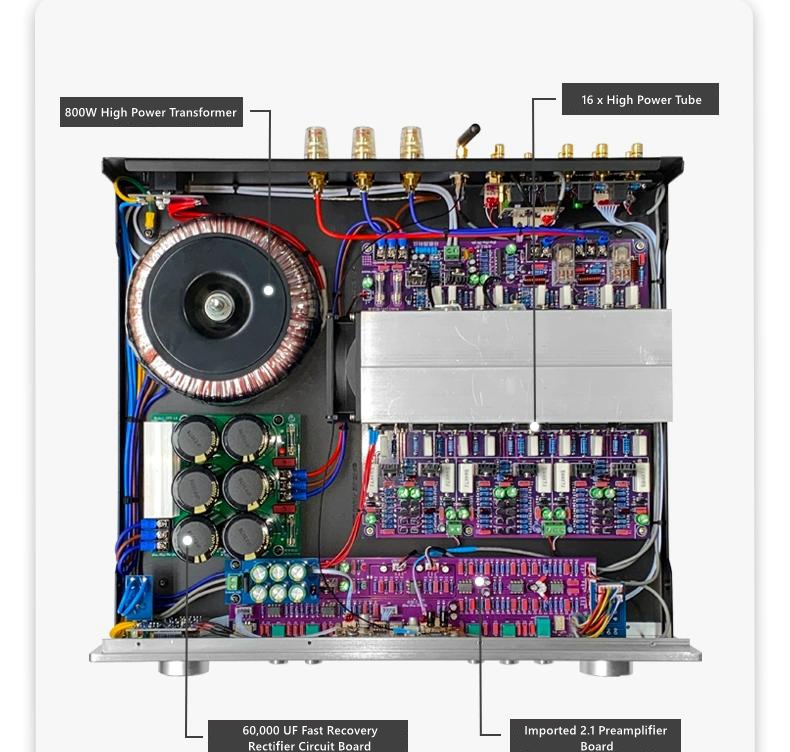 - 60000 UF fast recovery rectifier circuit board. 6 imported filters with a total capacity of 60000µF, fast recovery rectifier circuit, sufficient capacity, small ripple, deep and powerful, full of elasticity and penetrating audio experience.