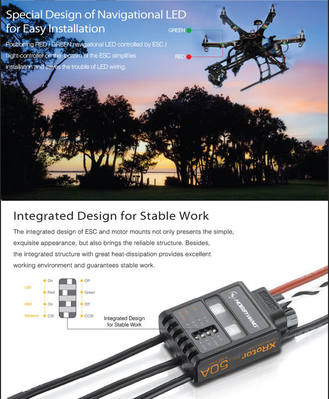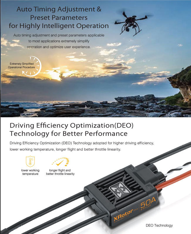 3. Use synchronous rectification when the throttle is reduced, the ESC will reduce the active braking quickly. It can greatly enhance the attitude and heading stability multi-rotor aircraft, with a higher drive efficiency.