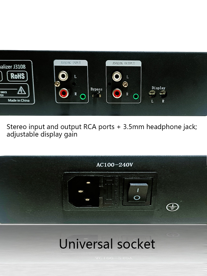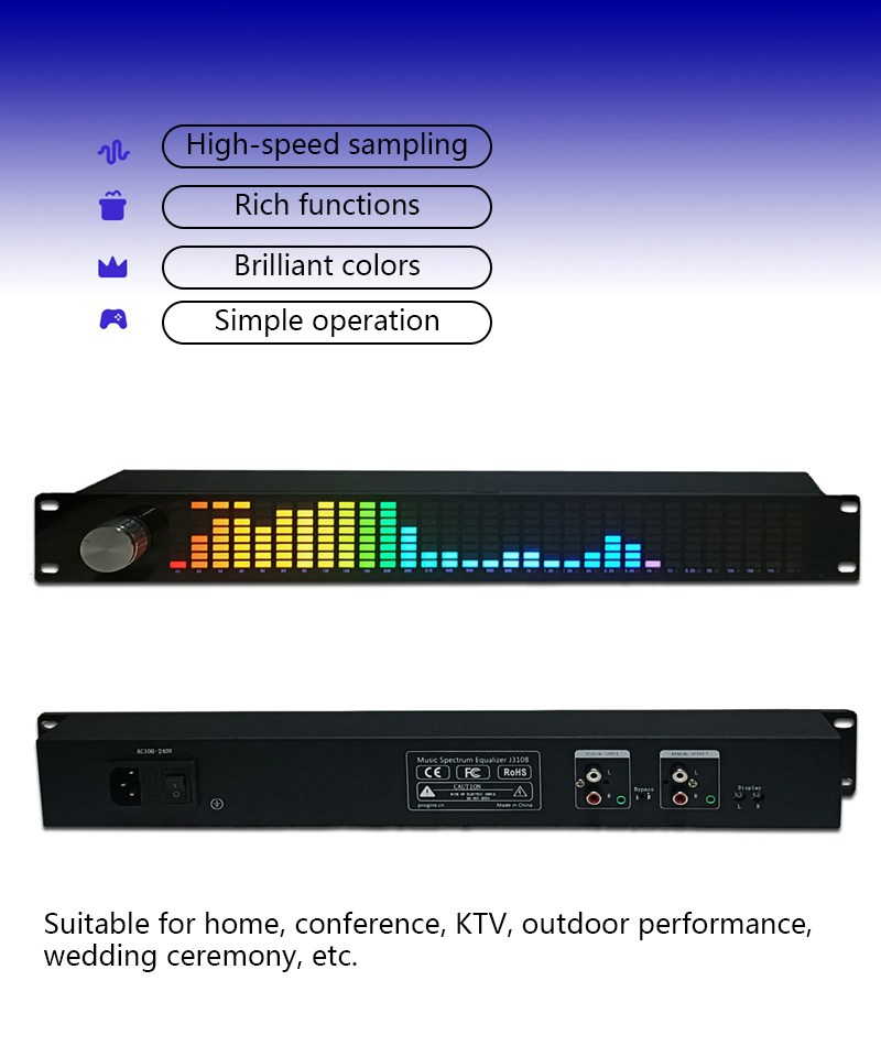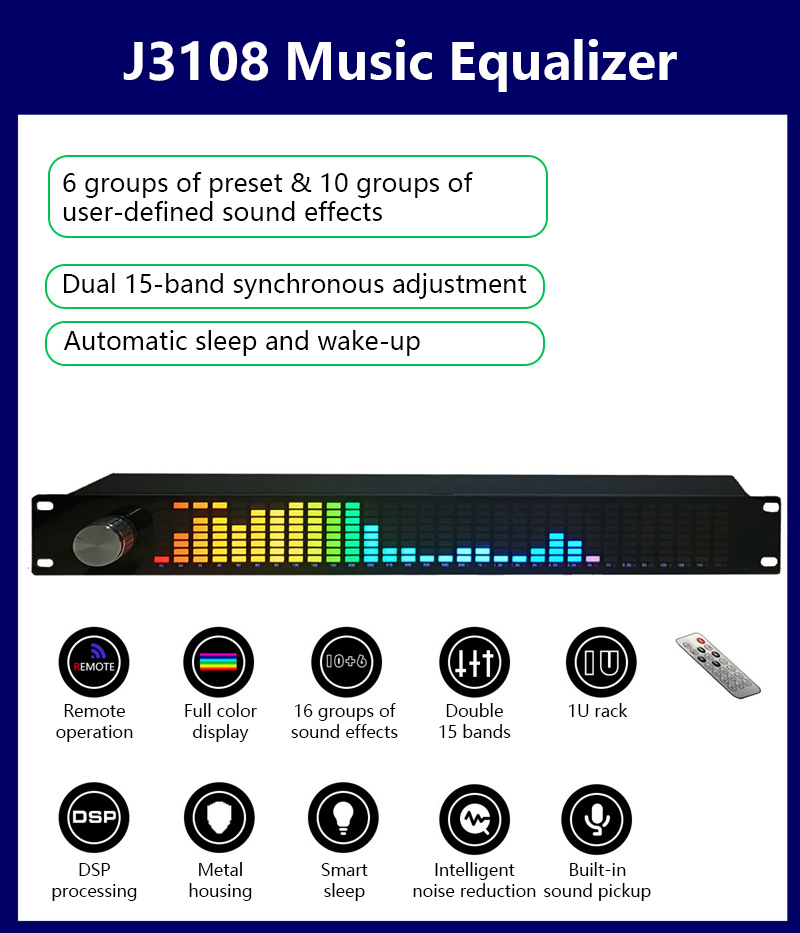 Using a new DSP technology, the equalizer can simultaneously perform 15-band frequency gain adjustment (EQ) on two audio channels. There are built-in 6 groups of fixed sound effects and 10 groups of user-defined sound effects. Built-in DSP, noise reduction processing and gain adjustment of input and output. Its display part supports AGC control and 31-band full color display. Multiple modes can be switched.