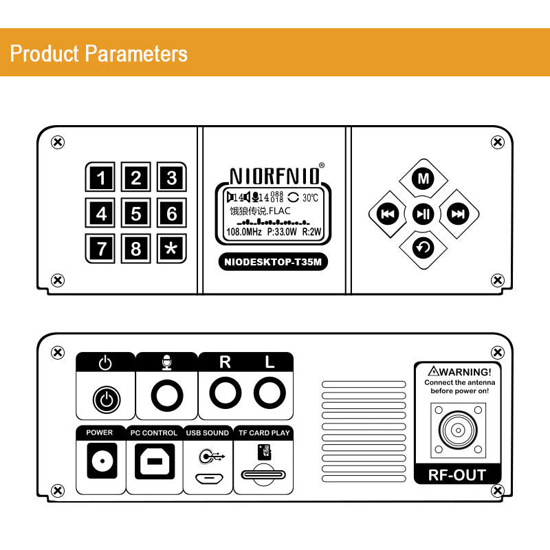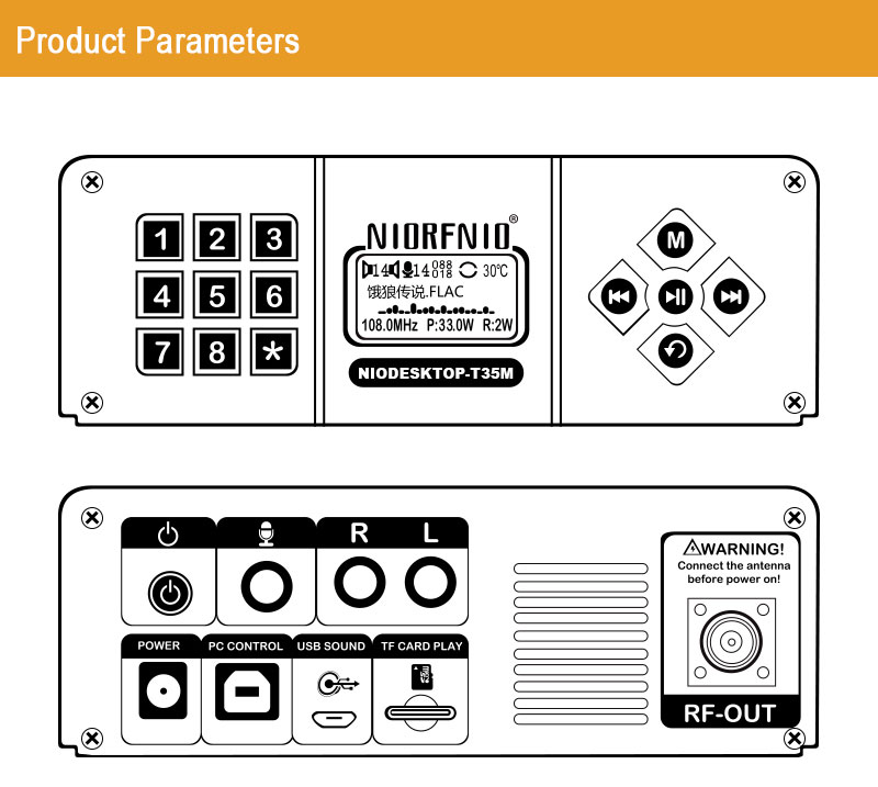 - When the antenna is disconnected or in bad matching, the device will sound an alarm and enter into protection mode. When the internal temperature is too high, it will sound an alarm and start automatic protection status.