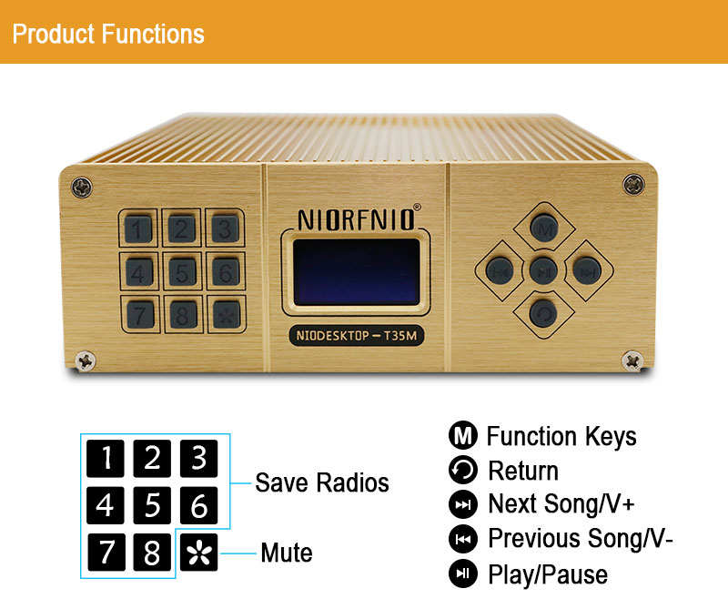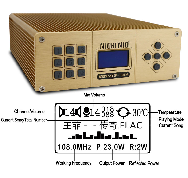 - 1-8 Function Keys: When the frequency of the transmitter is adjusted, press and hold number keys, the frequency in the lower left corner flashes and current radios are saved. Short press the number keys and it will read the stored frequency. * button is for mute.