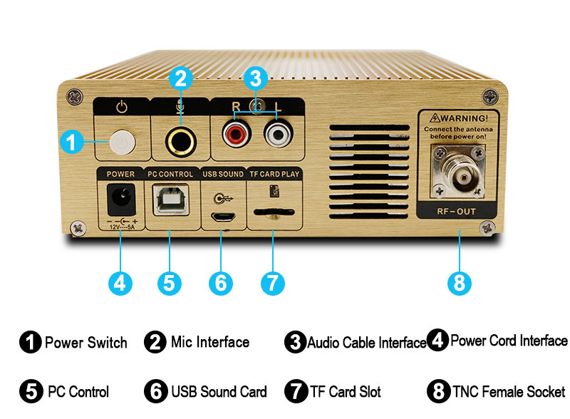 - Audio Input Connectors: RCA Female Connector/ USB Data Cable/ TF Card