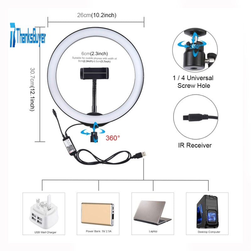 1. LED ring light can be mounted on the holder and take it anywhere, it can also be removed from the stand at any time, the tripod ball head can 360 degree rotating can free to adjust to any angle (The holder is not included).