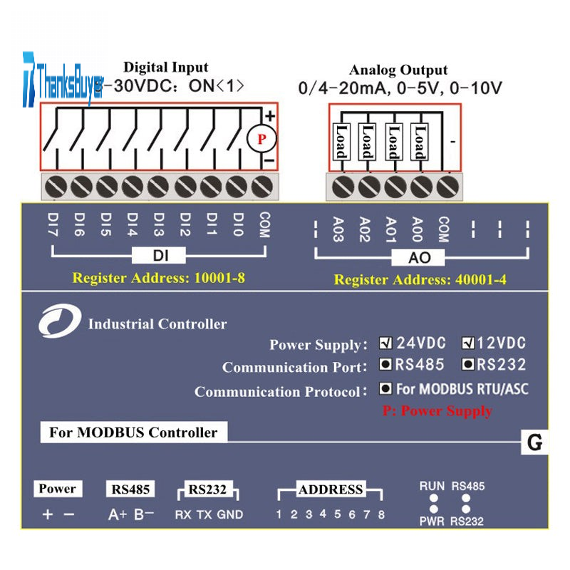 4AO + 8DI Data Acquisition Industrial Controller 0-20mA/4-20mA 0-5V/0-10V RTU-307K [RS232 RS485]