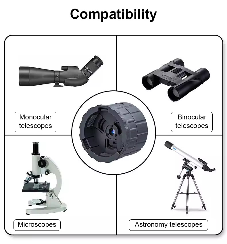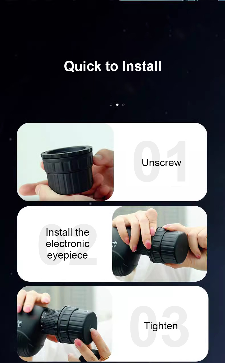 - The electronic eyepiece can be installed on optical telescopes and microscopes (the eyepiece size of telescopes and microscopes is within 30-50mm/1.2-2"), so that they have the function of cameras. Users can take photos and videos of observed scenes;