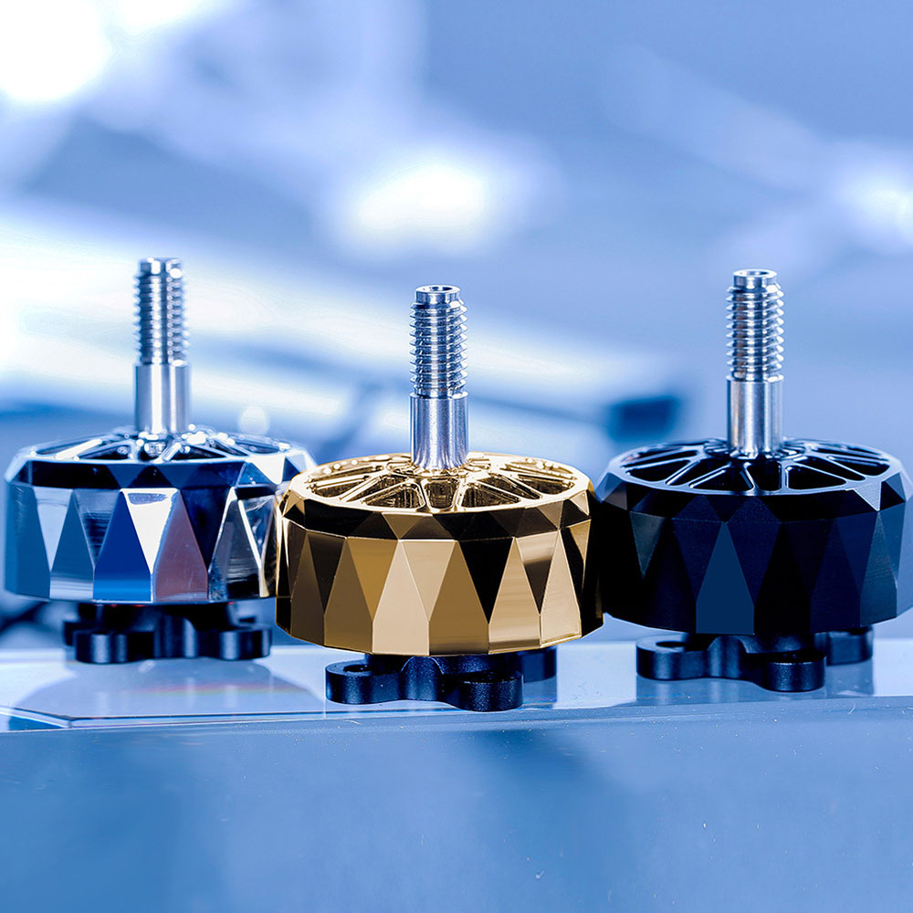 XING performance refined to another level. 10mm high-end bearings and bigger stator volume with increased thrust but just a little more weight and cost. All new Bling-Bling design to show off at every race, but that's what XING motors is about. We took all our XING motor experience and refined the whole stator to optimize your flying experience. MORE performance, MORE durability, MORE smooth and MORE eye-catcher.