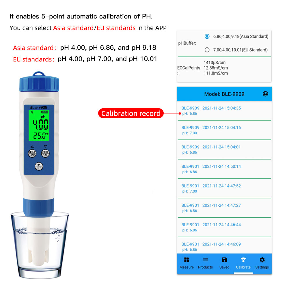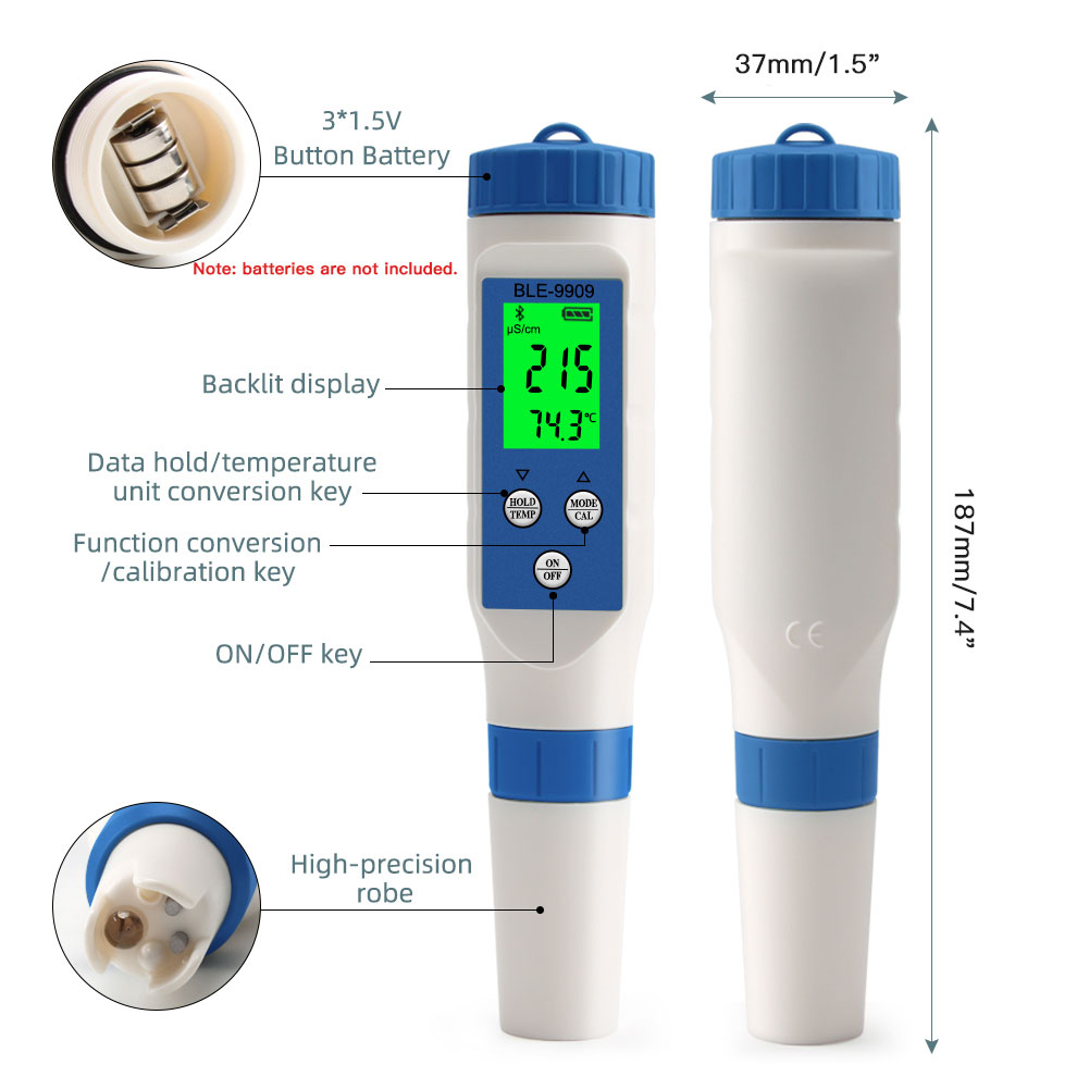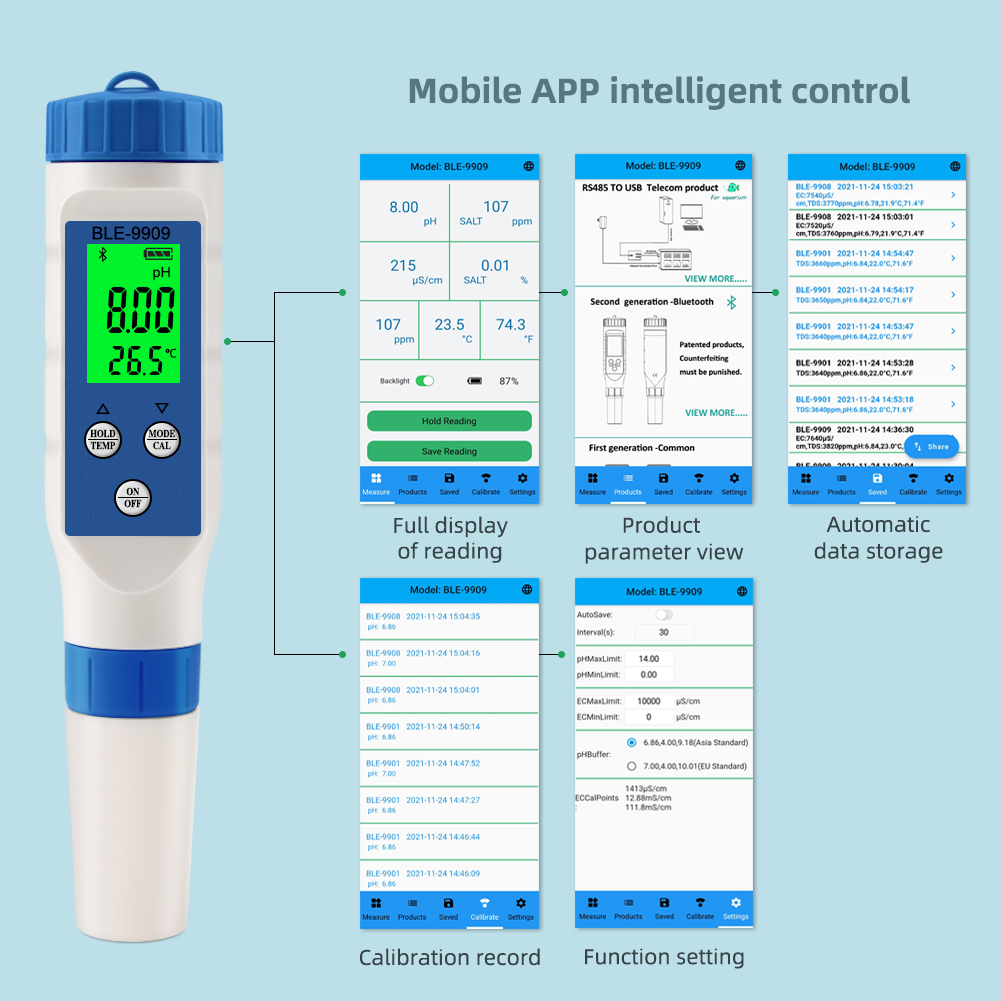 1. Multi-function Meter with Bluetooth: mobile phone APP intelligent control, mobile phone full screen multi-parameter display, professional measurement of PH/TDS/EC/SALT, and Temp. The mobile phone can control the backlight. Drinking water, Aquarium, Fish Tank, Swimming Pool, Farmland irrigation, Laboratory, etc.