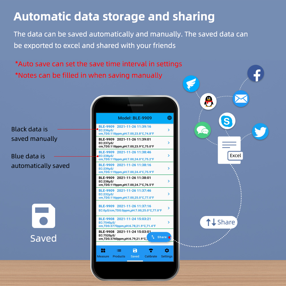 2. Cloud Based Data Management System: Precision real-time Bluetooth data transmission, Synchronize save time and data record, Share data or print excel tables, the mobile phone can view the calibration record
