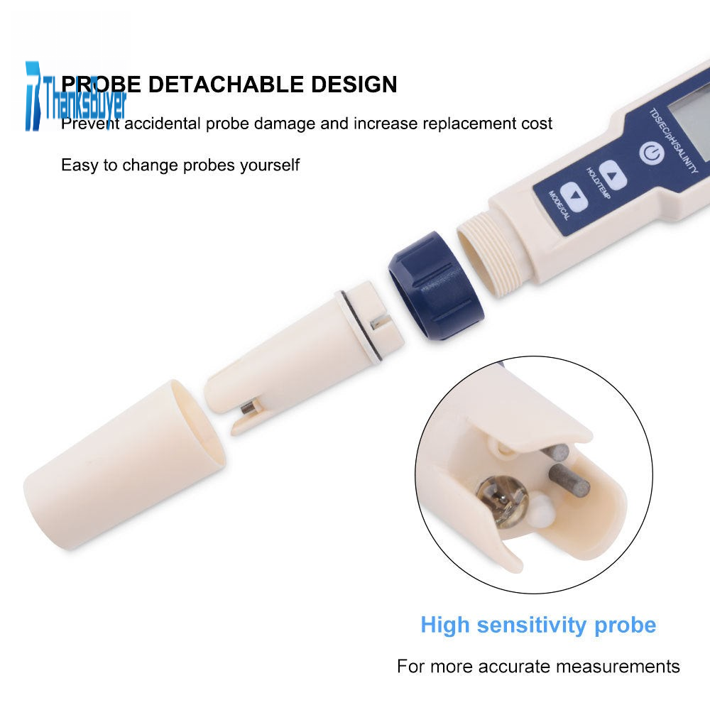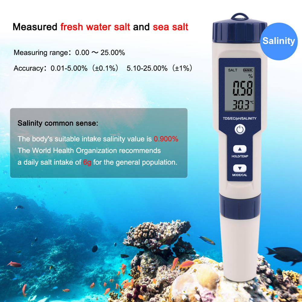- Five-in-1: measure PH, TDS, EC, salinity and temperature
