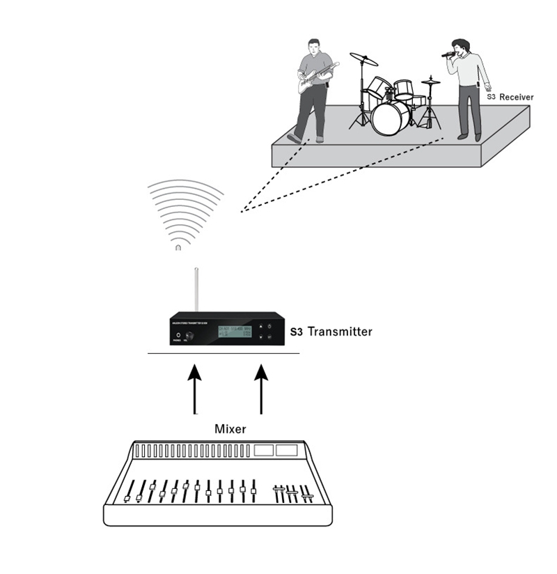 When multiple performers in the band have different monitoring requirements, multiple S3 systems can be used at the same time to send different audio mixing tune through each transmitter.