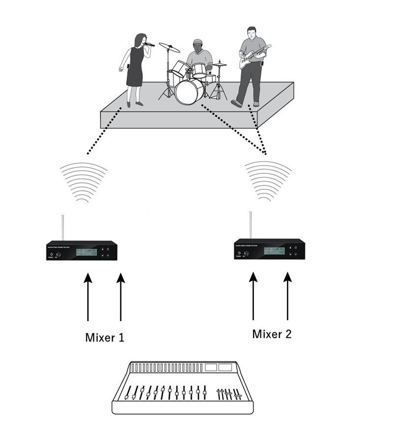 - A transmitter with multiple receivers and multiple performers can monitor audio from the same transmitter and adjust the signal personalized mixing through the receiver. Just set each receiver and transmitter to the same frequency and use the mixing mode to adjust the mixing.