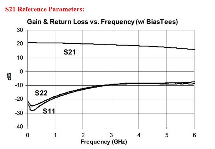 - Wide frequency range, stable gain, small noise figure and large dynamic range (+ 20dBm @ 1dBP)