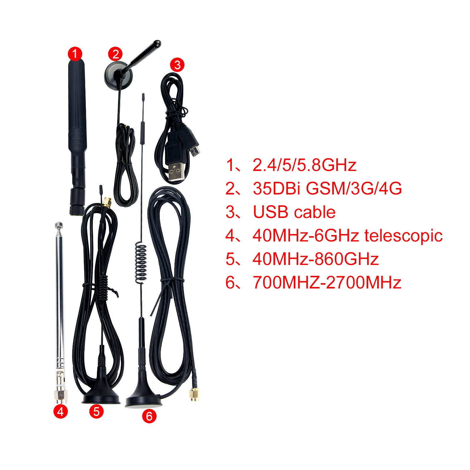 There are 5 antennas and 1 USB cable. The antenna kit can be used for Hackrf One SDR radio.