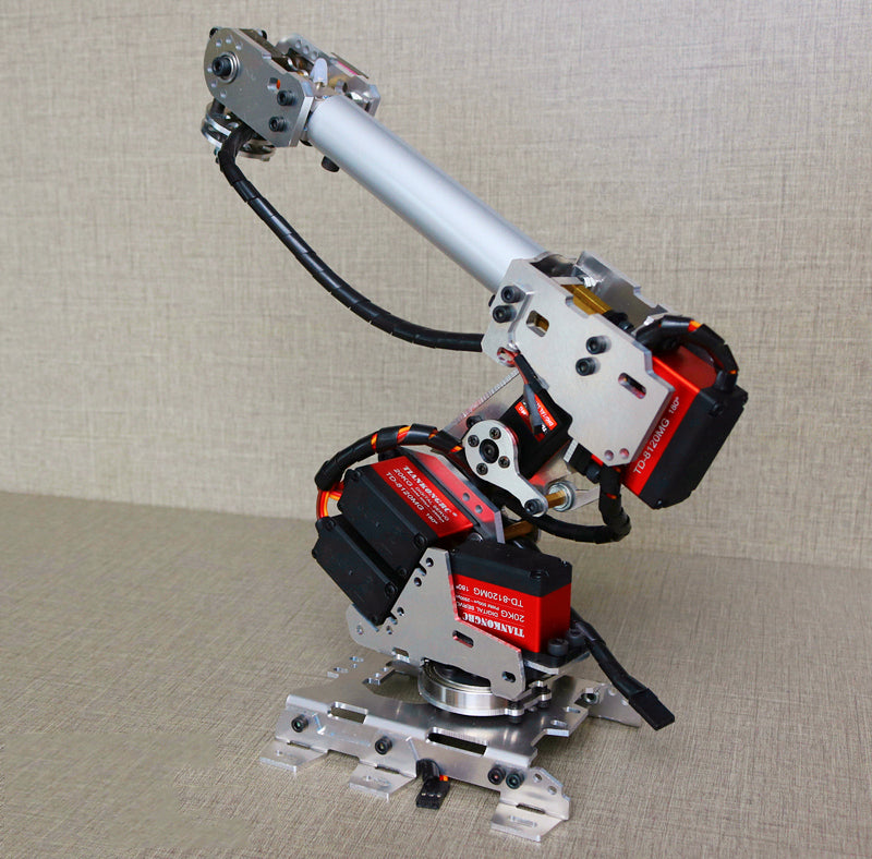 DOF robotic mechanical arm (waist, upper arm, lower arm, lower arm rotation, wrist, wrist rotation), all-metal robotic arm, bottom joint high-quality all-steel large bearing fixed, more stable operation.