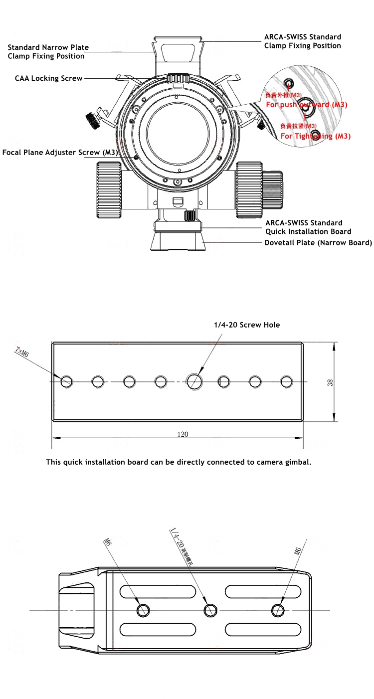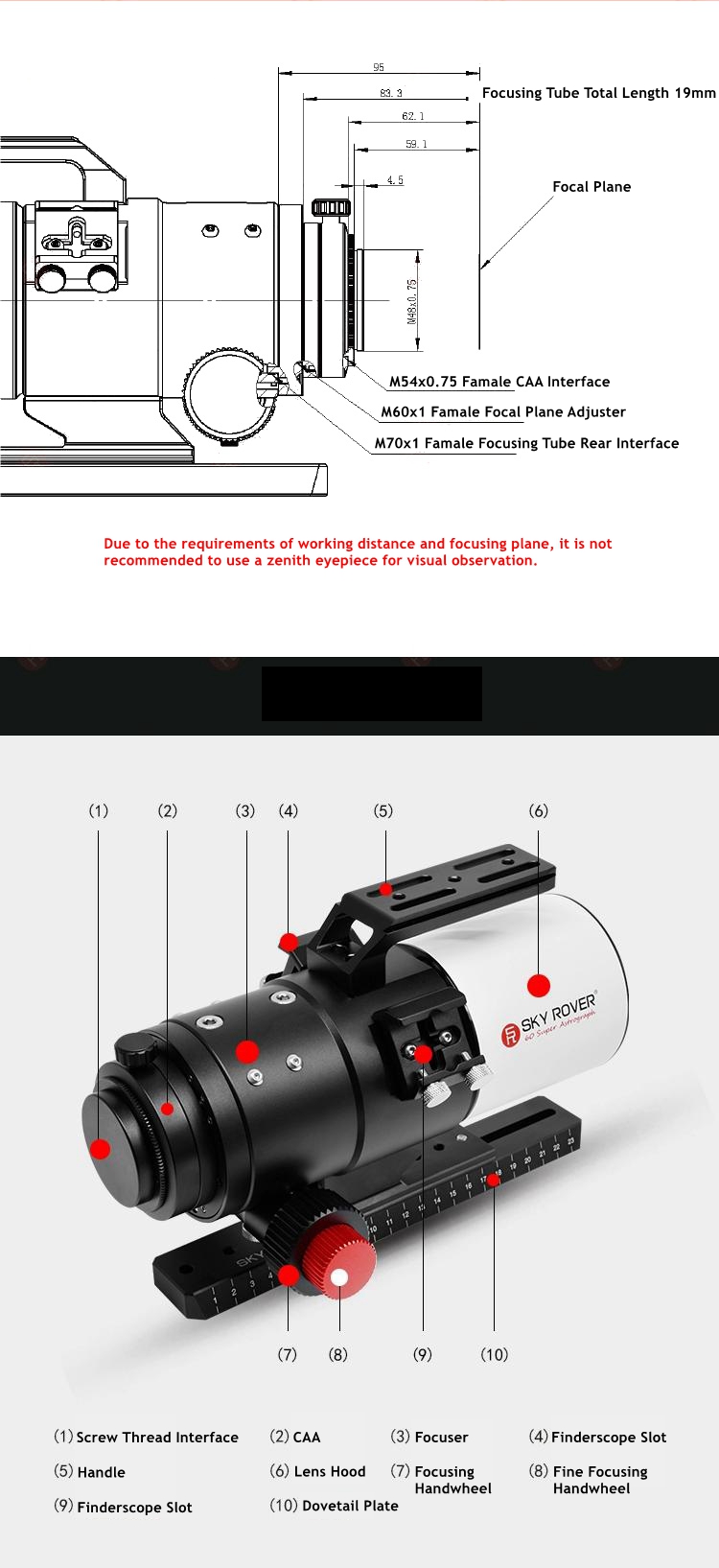 - Focusing: 2.8-inch aluminum alloy dual speed toothed focusing base with an effective stroke of 19mm; the end screw of the focusing tube comes standard with a new field rotator (CAA) and integrates a focal plane adjuster; The rear end of the focusing tube provides M70x1, M60x1, M54x0.75, M48x0.75 threaded interfaces