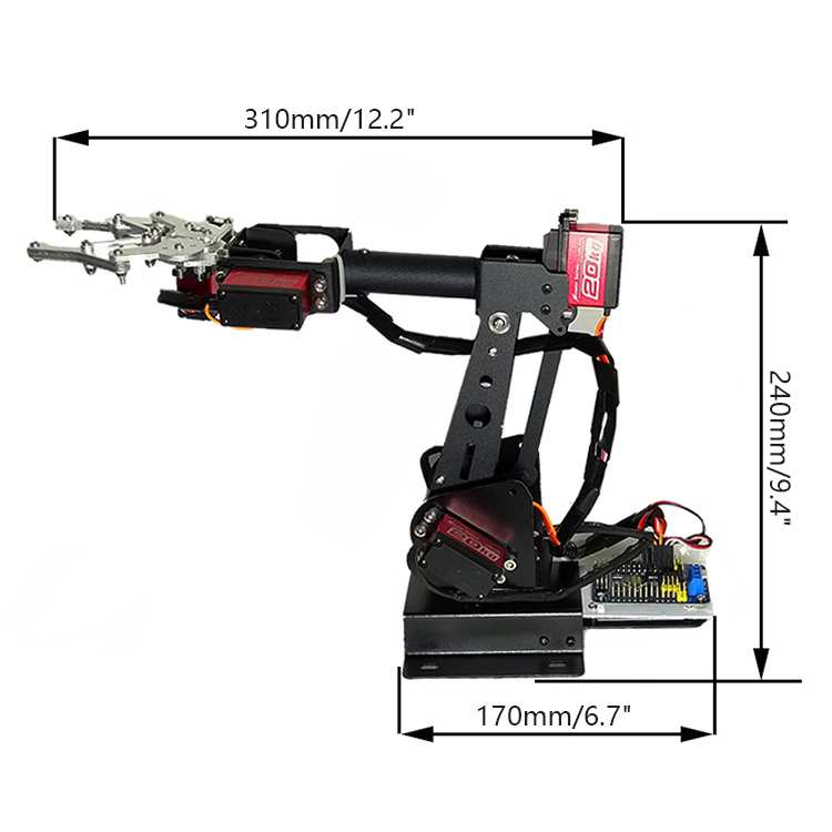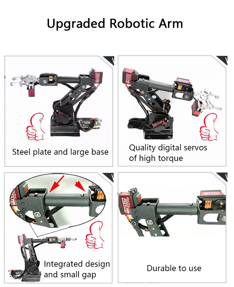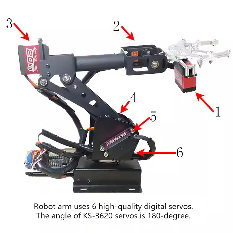 - The mechanical arm adopts 6pcs high-power digital servos, and the starting current is at least 2A.