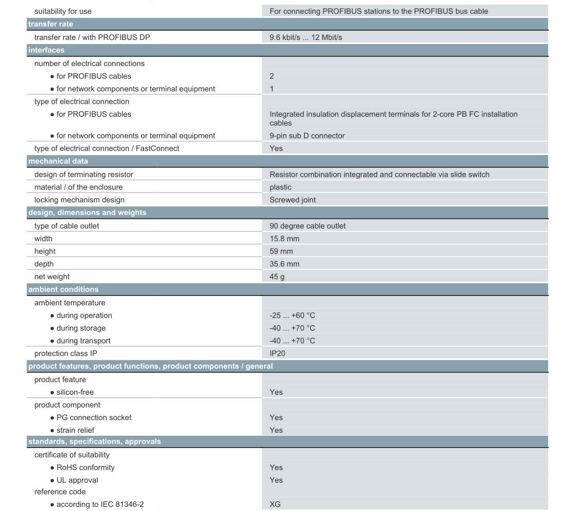 DP, Connection plug for PROFIBUS up to 12 Mbit/s 90° cable outlet, Insulation displacement method FastConnect, With PG receptacle 15.8x59x35.6mm (BxHxD).