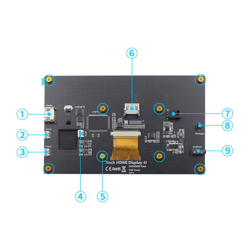 ⑧ HDMI interface: input HDMI signal. Use an HDMI adapter to connect. Only for connecting a board for Raspberry Pi and the maximum resolution is 1024x600.