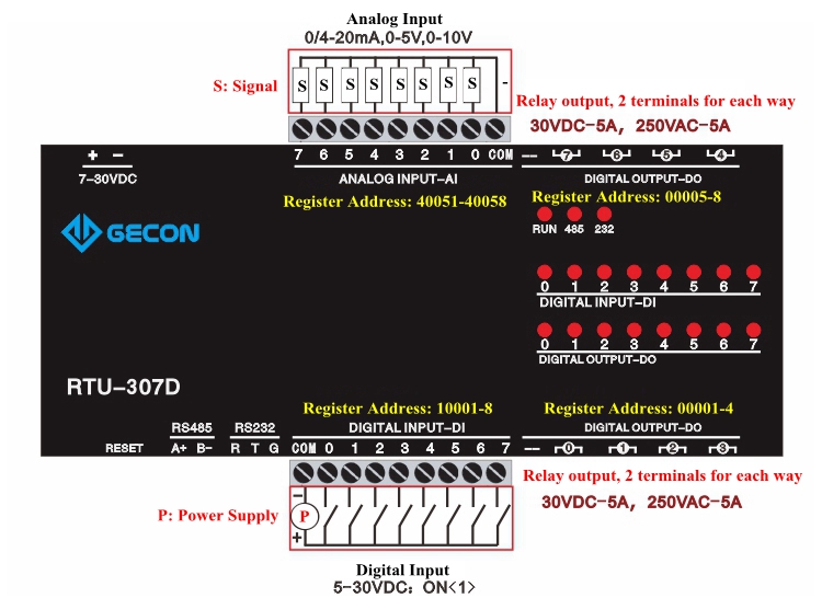 - Contact capacity: normally open relay: 5A/250VAC, 5A/30VDC