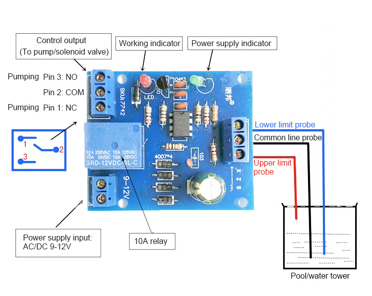 There are three probes (wires), namely S, Z and X. When two of the probes leave the water, the relay will be closed. When the three probes are soaked in water, the relay will be open.