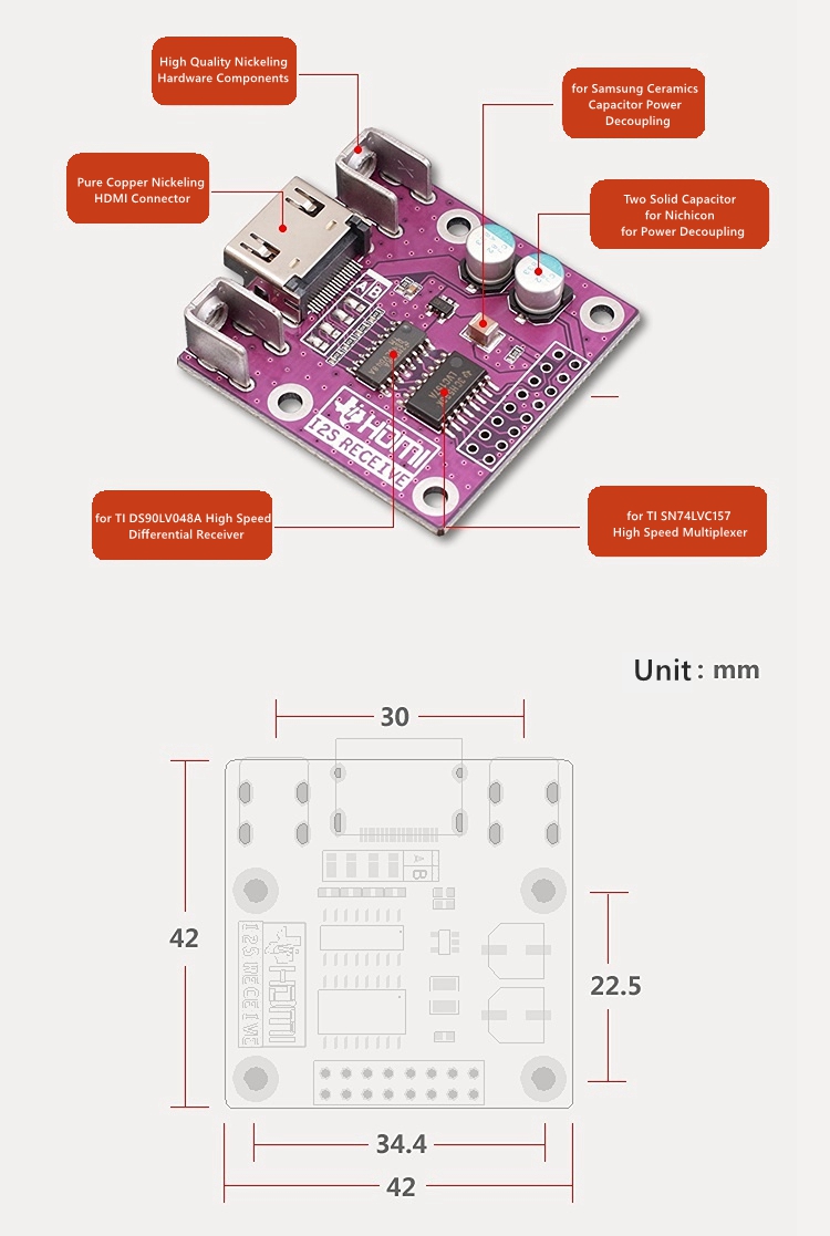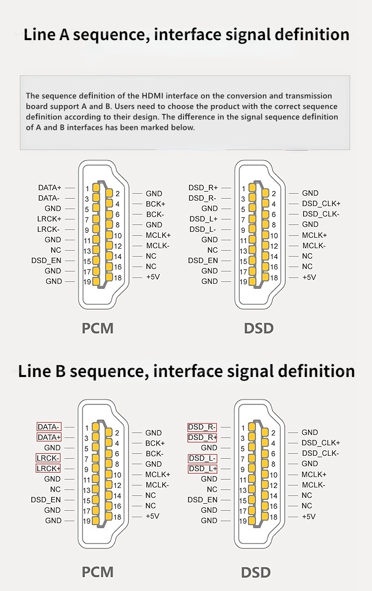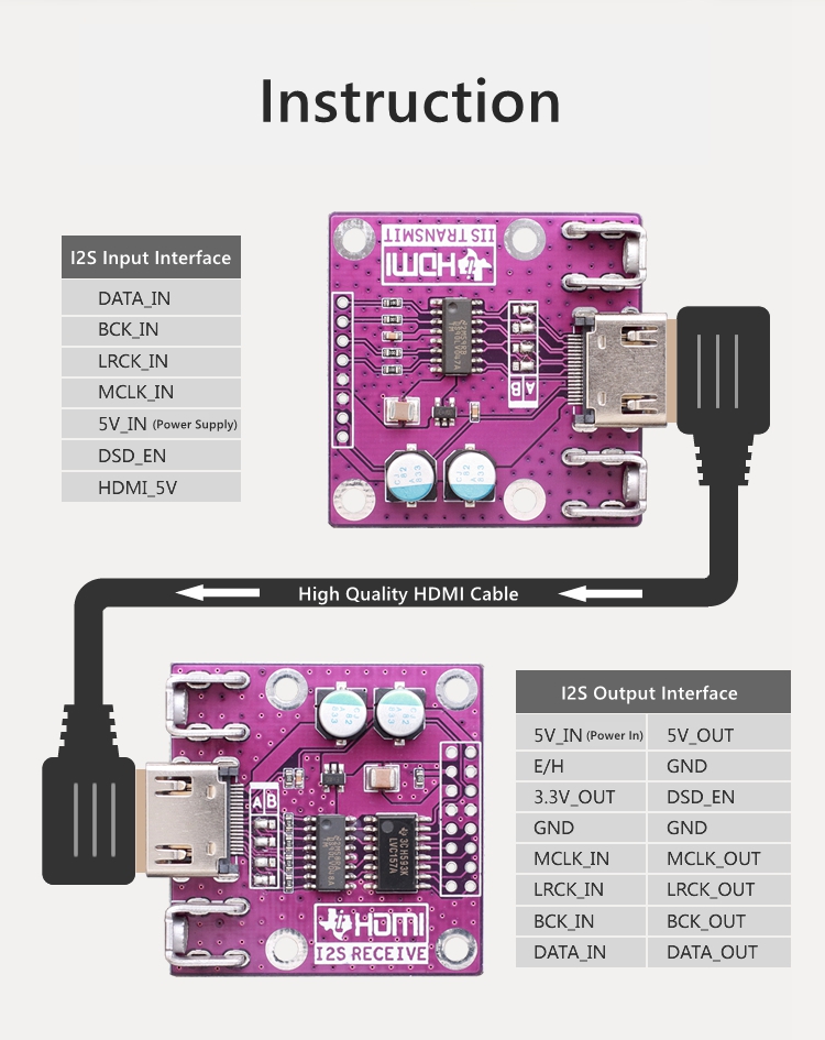 - It adopts for TI original DS90LV047A high speed differential transmission chip, which can convert single-end I2S or DSD signal to differential I2S signal and output through HDMI interface. It support data transmission speed rate above 400Mbps (200MHz).