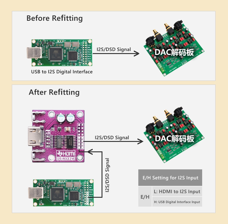 A Wire Sequential I2S to HDMI Transmitter Module for Single-end I2S/DSD to Differential I2S Signal Conversion for DAC Decoder