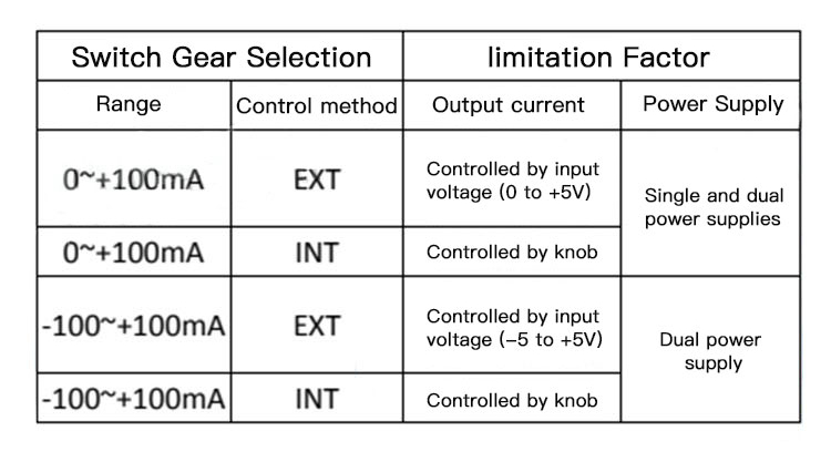 3. Control voltage interface (input -5V to +5V and output current -100 to +100mA; input 0 to +5V and output current 0 to +100mA)