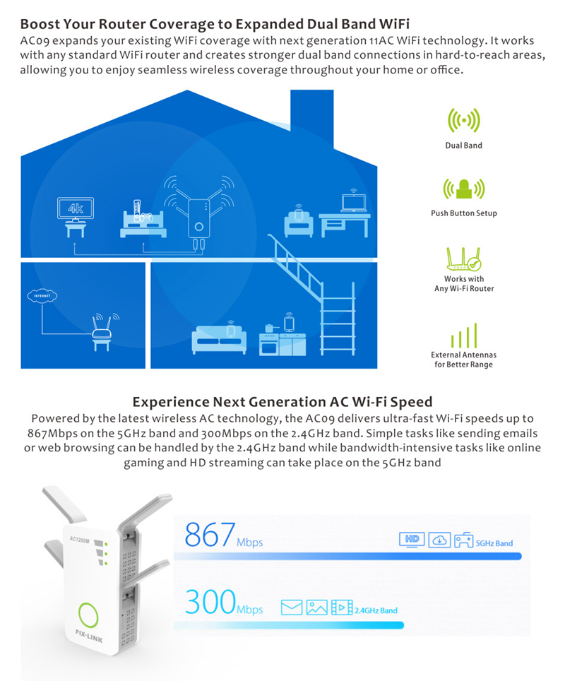 - Signal rate: 2.4GHz: up to 300Mbps; 5GHz: up to 867Mbps (dynamic)